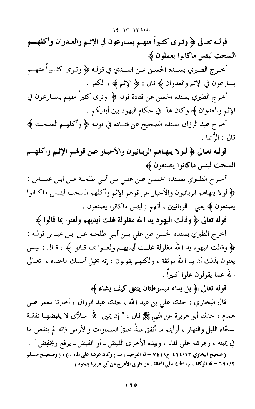 قوله تعالى (وقالت اليهود يد الله مغلولة غلت أيديهم ولعنوا بما قالوا) أخرج الطبري بسنده الحسن عن علي بن أبي طلحة عن ابن عباس قوله: (وقالت اليهود يد الله مغلولة غلت أيديهم ولعنوا بما قالوا) ، قال: ليس يعنون بذلك أن يد الله موثقة، ولكنهم يقولون: إنه بخيل أمسك ما عنده، تعالى الله عما يقولون علوا كبيراً.