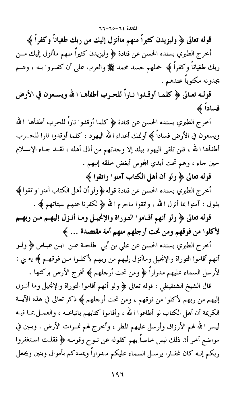 قال الشيخ الشنقيطي: قوله تعالى (ولو أنهم أقاموا التوراة والإنجيل وما أنزل إليهم من ربهم لأكلوا من فوقهم، ومن تحت أرجلهم) ذكر تعالى في هذه الآية الكريمة أن أهل الكتاب لو أطاعوا الله، وأقاموا كتابهم باتباعه، والعمل بما فيه ليسر الله لهم الأرزاق وأرسل عليهم المطر، وأخرج لهم ثمرات الأرض. وبين في مواضع أخر أن ذلك ليس خاصاً بهم كقوله عن نوح وقومه (فقلت استغفروا ربكم إنه كان غفارا يرسل السماء عليكم مدراراً ويمددكم بأموال وبنين ويجعل