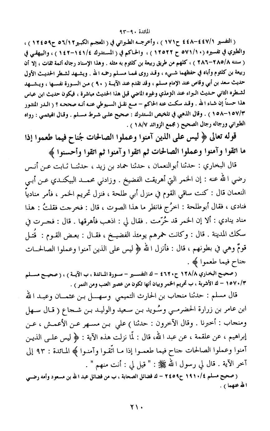 قال مسلم: حدثنا منجاب بن الحارث التميمي وسهل بن عثمان وعبد الله ابن عامر بن زرارة الحضرمي وسُويد بن سعيد والوليد بن شجاع (قال سهل ومنجاب: أخبرنا. وقال الآخرون: حدثنا) على بن مسهر عن الأعمش، عن إبراهيم، عن علقمة، عن عبد الله، قال: لمّا نزلت هذه الآية: (ليس على الذين آمنوا وعملوا الصالحات جناح فيما طعموا إذا ما اتّقوا وآمنوا) المائدة: 93 إلى آخر الآية. قال لي رسول الله - صَلَّى اللَّهُ عَلَيْهِ وَسَلَّمَ -: "قيل لي: أنت منهم".