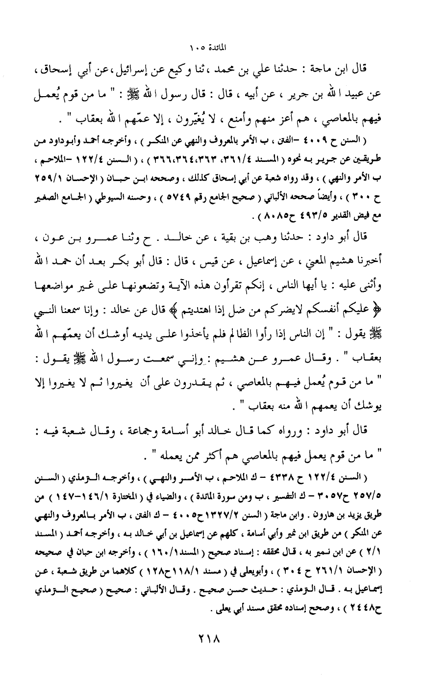 (السنن ح 4009 - الفتن، ب الأمر بالمعروف والنهي عن المنكر) ، وأخرجه أحمد وأبو داود من طريقين عن جرير به نحوه (المسند 4/361، 363، 364، 366) ، (السنن4/122 - الملاحم، ب الأمر والنهي) ، وقد رواه شعبة عن أبي إسحاق كذلك، وصححه ابن حبان (الإحسان 1/259 ح 300) ، وأيضاً صححه الألباني (صحيح الجامع رقم 5749) ، وحسنه السيوطي (الجامع الصغير مع فيض القدير 5/493 ح 8085) .