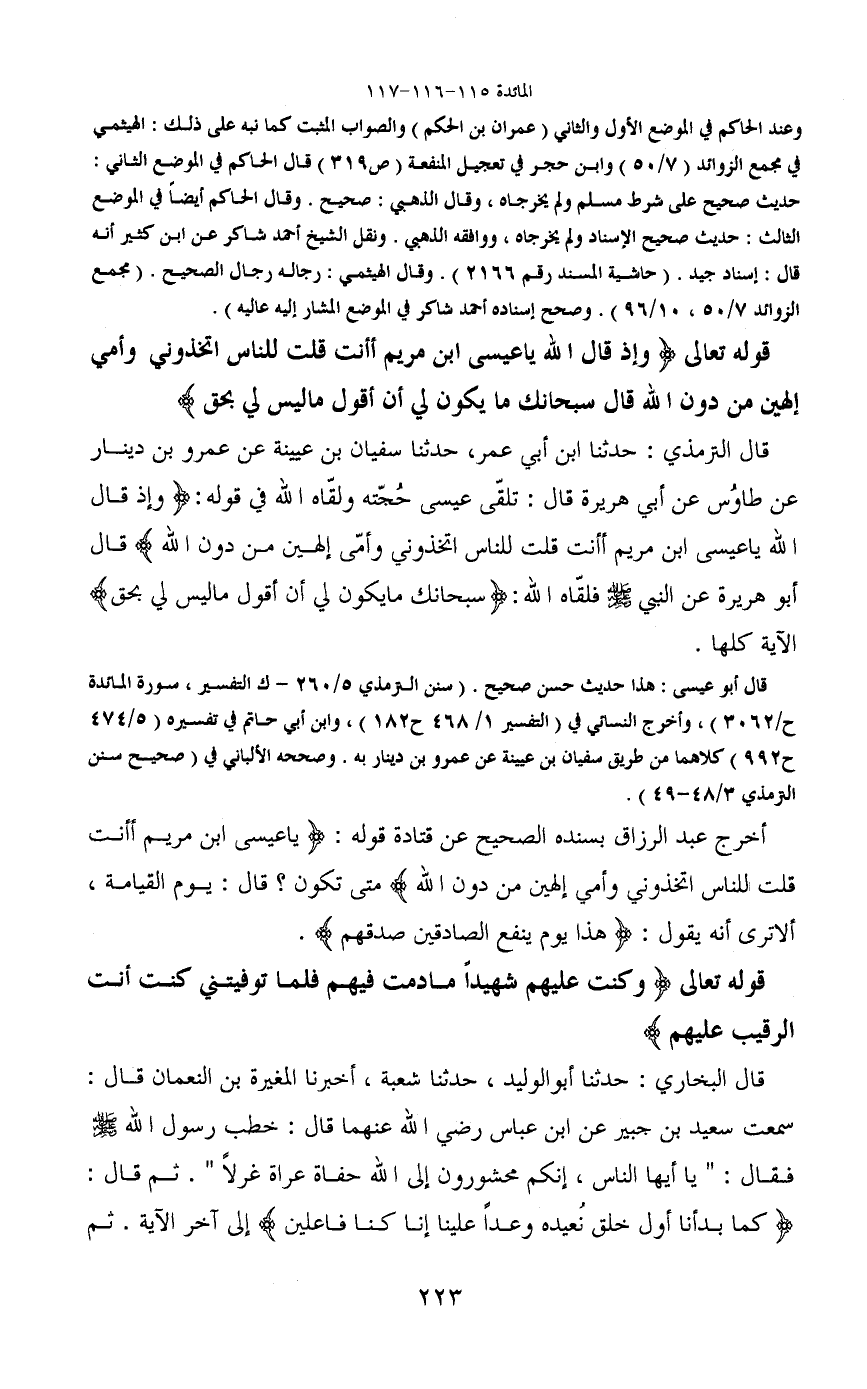 قال أبو عيسى: هذا حديث حسن صحيح. (سنن الترمذى 5/260 - ك التفسير، سورة المائدة ح /3062) ، وأخرج النسائي في (التفسير 1/468 ح 182) ، وابن أبي حاتم في تفسيره (5/474 ح 992) كلاهما من طريق سفيان بن عيينة عن عمرو بن دينار به. وصححه الألبانى في (صحيح سنن الترمذى 3/48-49) .