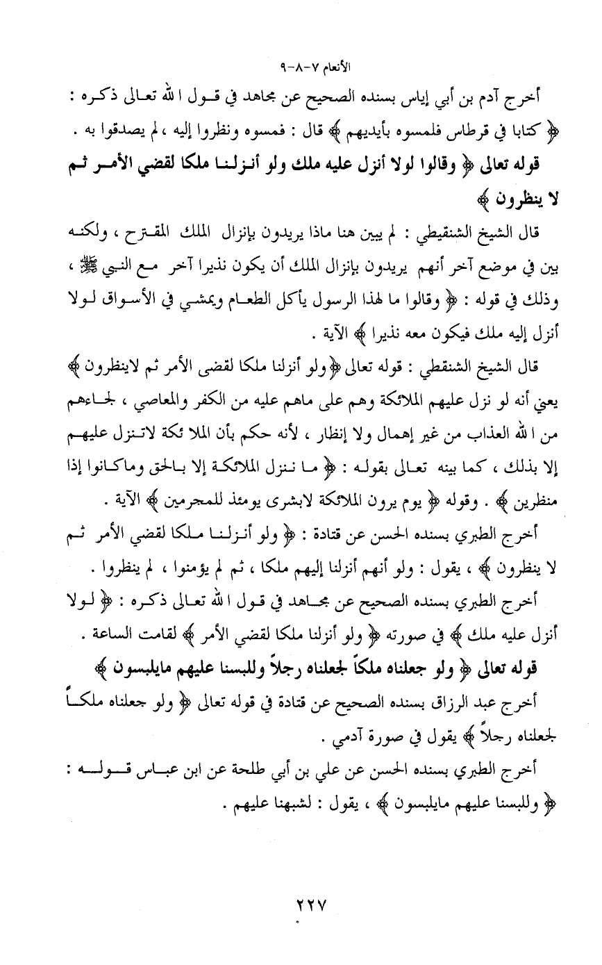 قال الشيخ الشنقيطي: قوله تعالى (ولو أنزلنا ملكا لقضى الأمر ثم لا ينظرون) يعني أنه لو نزل عليهم الملائكة وهم على ماهم عليه من الكفر والمعاصي، لجاءهم من الله العذاب من غير إهمال ولا إنظار، لأنه حكم بأن الملائكة لا تنزل عليهم إلا بذلك، كما بينه تعالى بقوله: (ما ننزل الملائكة إلا بالحق وما كانوا إذا منظرين) . وقوله (يوم يرون الملائكة لا بشرى يومئذ للمجرمين) الآية.