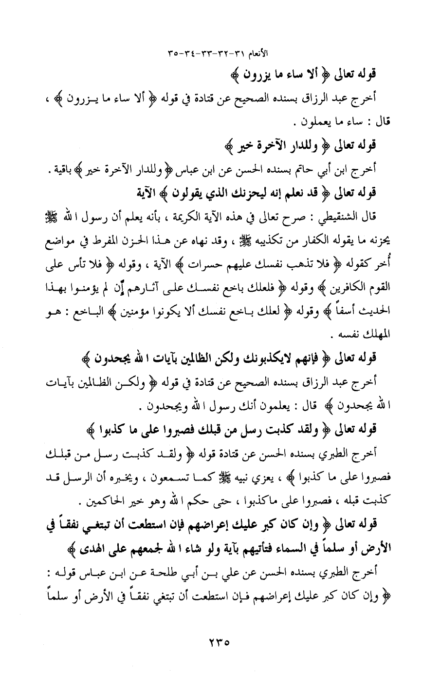 قال الشنقيطي: صرح تعالى في هذه الآية الكريمة، بأنه يعلم أن رسول الله - صَلَّى اللَّهُ عَلَيْهِ وَسَلَّمَ - يحزنه ما يقوله الكفار من تكذيبه - صَلَّى اللَّهُ عَلَيْهِ وَسَلَّمَ -، وقد نهاه عن هذا الحزن المفرط في مواضع أخر كقوله (فلا تذهب نفسك عليهم حسرات) الآية، وقوله (فلا تأس على القوم الكافرين) وقوله (فلعلك باخع نفسك على أثارهم إن لم يؤمنوا بهذا الحديث أسفاً) وقوله (لعلك باخع نفسك ألا يكونوا مؤمنين) الباخع: هو المهلك نفسه.
