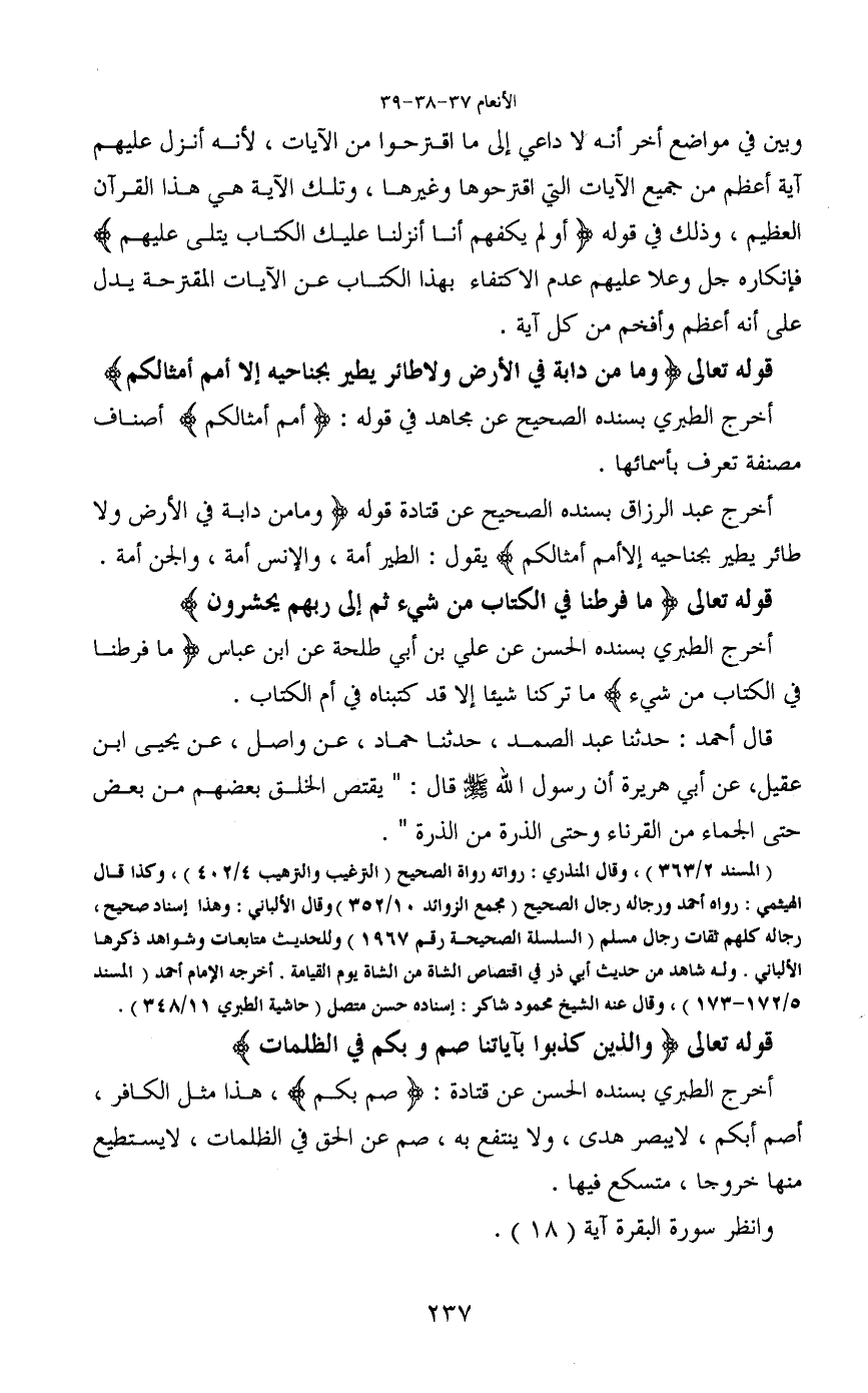 (المسند 2/363) ، وقال المنذري: رواته رواة الصحيح (الترغيب والترهيب 4/402) ، وكذا قال الهيثمي: رواه أحمد ورجاله رجال الصحيح (مجمع الزوائد 10/352) وقال الألباني: وهذا إسناد صحيح، رجاله كلهم ثقات رجال مسلم (السلسله الصحيحة رقم 1967) وللحديث متابعات وشواهد ذكرها الألباني. وله شاهد من حديث أبي ذر في اقتصاص الشاة من الشاة يوم القيامة. أخرجه الإمام أحمد (المسند 5/172-173) ، وقال عنه الشيخ محمود شاكر: إسناده حسن متصل (حاشية الطبري 11/348) .