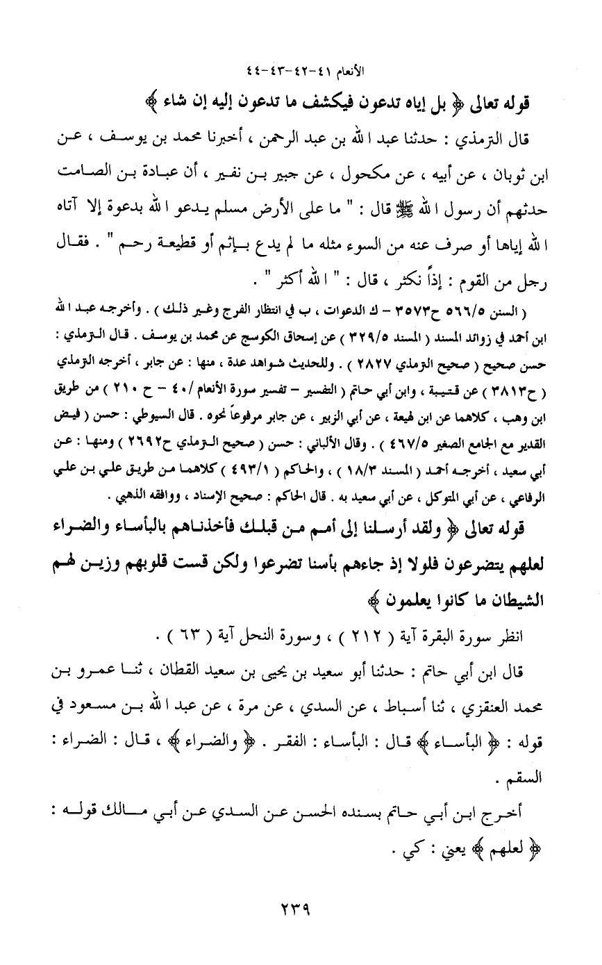 (السنن 5/566 ح 3573 - ك الدعوات، ب في انتظار الفرج وغير ذلك) . وأخرجه عبد الله ابن أحمد في زوائد المسند (المسند 5/329) عن إسحاق الكوسج عن محمد بن يوسف. قال الترمذى: حسن صحيح (صحيح الترمذي 2827) . وللحديث شواهد عدة، منها: عن جابر، أخرجه الترمذى (ح 3813) عن قتيبة، وابن أبي حاتم (التفسير - تفسير سورة الأنعام/40 - ح 210) من طريق ابن وهب، كلاهما عن ابن لهيعة، عن أبي الزبير، عن جابر مرفوعاً نحوه. قال السيوطي. حسن (فيض القدير مع الجامع الصغير 5/467) . وقال الألباني: حسن (صحيح الترمذي ح 2692) ومنها: عن أبي سعيد، أخرجه أحمد (المسند 3/18) ، والحاكم (1/493) كلاهما من طريق علي بن علي الرفاعي، عن أبي المتوكل، عن أبي سعيد به. قال الحاكم: صحيح الإسناد، ووافقه الذهبي.