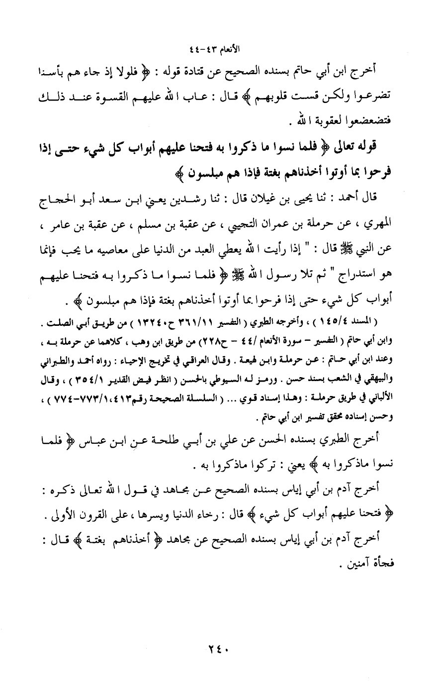 وابن أبي حاتم (التفسير - سورة الأنعام/44 - ح 228) من طريق ابن وهب كلاهما عن حرملة به، وعند ابن أبي حاتم: عن حرملة وابن لهيعة. وقال العراقي في تخريج الإحياء: رواه أحمد والطبراني والبيهقي في الشعب بسند حسن. ورمز له السيوطي بالحسن (انظر فيض القدير 1/354) ، وقال الألبانى في طريق حرملة: وهذا إسناد قوي ... (السلسله الصحيحة رقم 413، 1/773-774) ، وحسن إسناده محقق تفسير ابن أبي حاتم.