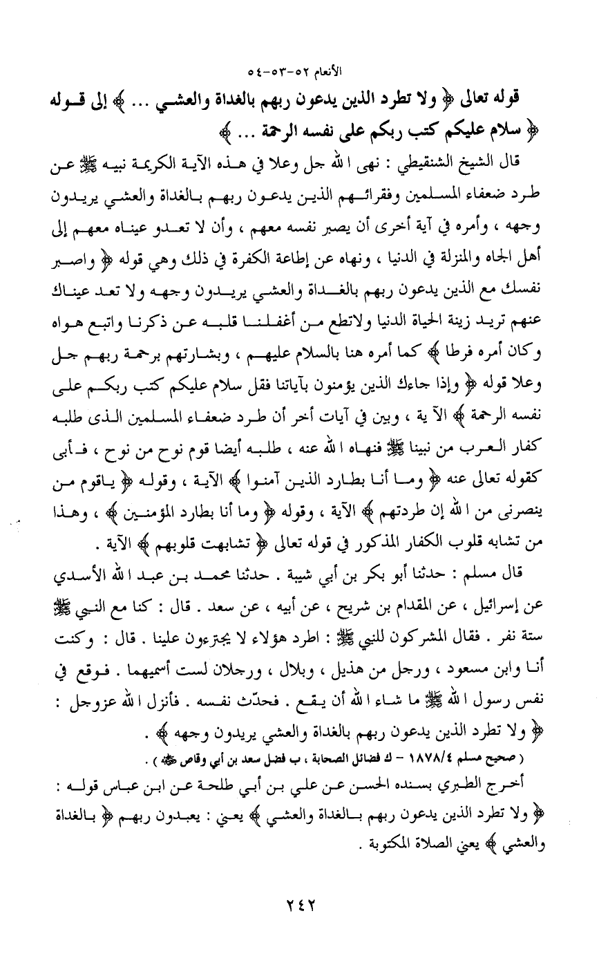 قال الشيخ الشنقيطي: نهى الله جل وعلا في هذه الآية الكريمة نبيه - صَلَّى اللَّهُ عَلَيْهِ وَسَلَّمَ - عن طرد ضعفاء المسلمين وفقرائهم الذين يدعون ربهم بالغداة والعشي يريدون وجهه، وأمره في آية أخرى أن يصبر نفسه معهم، وأن لا تعدو عيناه معهم إلى أهل الجاه والمنزلة في الدنيا، ونهاه عن إطاعة الكفرة في ذلك وهي قوله (واصبر نفسك مع الذين يدعون ربهم بالغداة والعشي يريدون وجهه ولا تعد عيناك عنهم تريد زينة الحياة الدنيا ولا تطع من أغفلنا قلبه عن ذكرنا واتبع هواه وكان أمره فرطا) كما أمره هنا بالسلام عليهم، وبشارتهم برحمة ربهم جل وعلا قوله (وإذا جاءك الذين يؤمنون بآياتنا فقل سلام عليكم كتب ربكم على نفسه الرحمة) الآية، وبين في آيات أخر أن طرد ضعفاء المسلمين الذي طلبه كفار العرب من نبينا - صَلَّى اللَّهُ عَلَيْهِ وَسَلَّمَ - فنهاه الله عنه، طلبه أيضاً قوم نوح من نوح، فأبى كقوله تعالى عنه (وما أنا بطارد الذين آمنوا) الآية، وقوله (يا قوم من ينصرنى من الله إن طردتهم) الآية، وقوله (وما أنا بطارد المؤمنين) ، وهذا من تشابه قلوب الكفار المذكور في قوله تعالى (تشابهت قلوبهم) الآية.