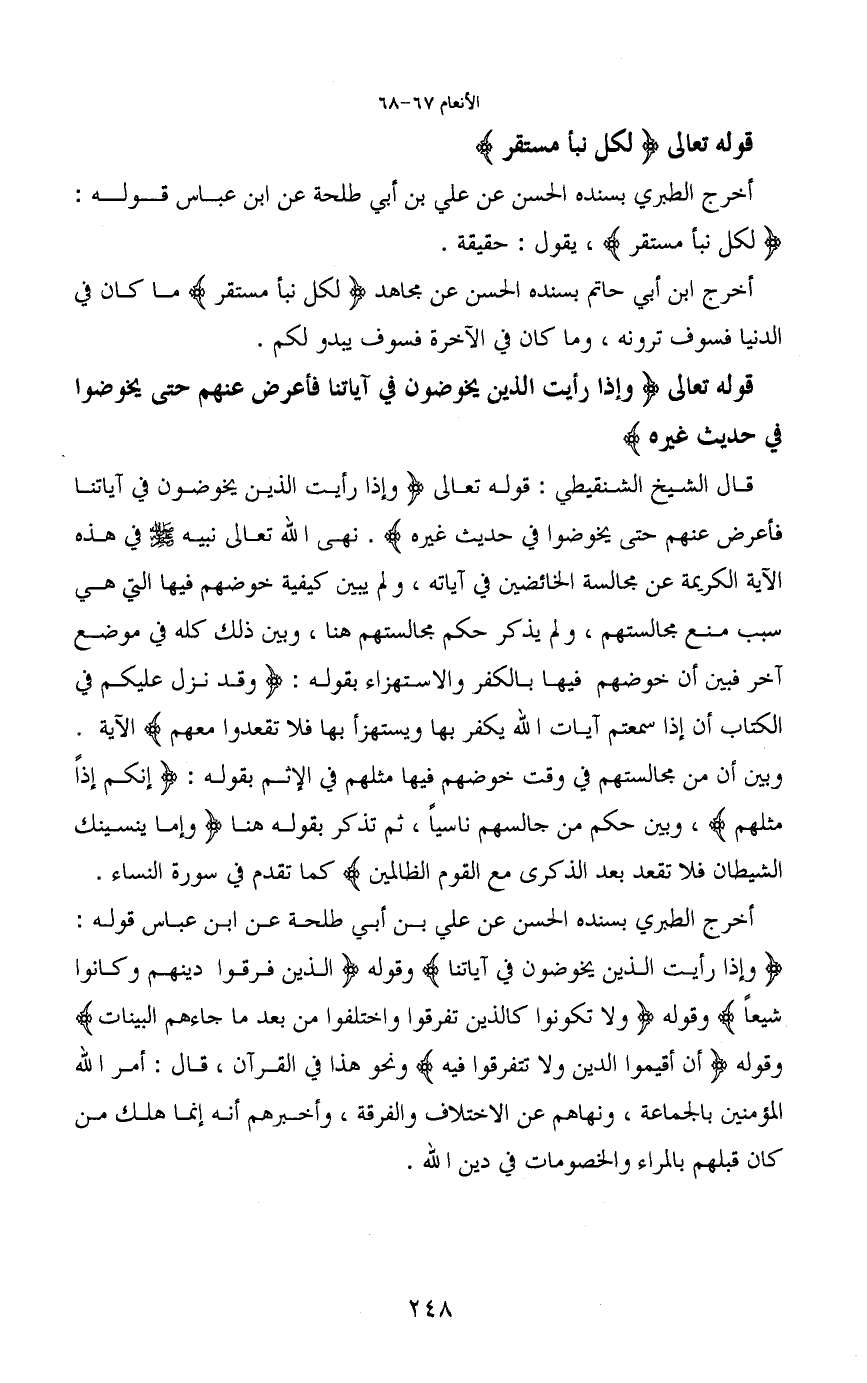قال الشيخ الشنقيطي: قوله تعالى (وإذا رأيت الذين يخوضون في آياتنا فأعرض عنهم حتى يخوضوا في حديث غيرة) . نهى الله تعالى نبيه - صَلَّى اللَّهُ عَلَيْهِ وَسَلَّمَ - في هذه الآية الكريمة عن مجالسة الخائضين في آياته، ولم يبين كيفية خوضهم فيها التي هي سبب منع مجالستهم، ولم يذكر حكم مجالستهم هنا، وبين ذلك كله في موضع أخر فبين أن خوضهم فيها بالكفر والاستهزاء بقوله: (وقد نزل عليكم في الكتاب أن إذا سمعتم آيات الله يكفر بها ويستهزأ بها فلا تقعدوا معهم) الآية.