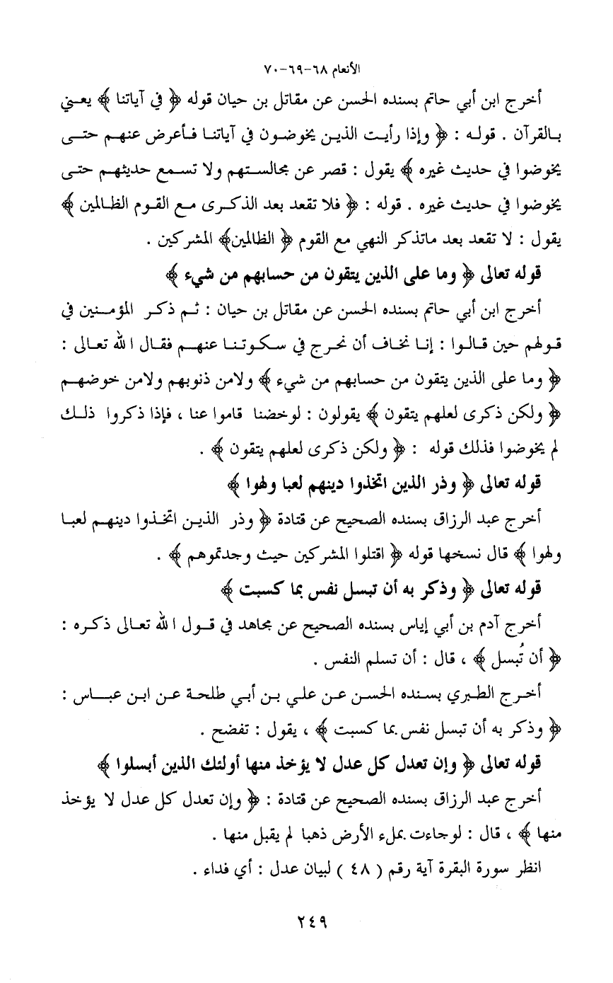 أخرج ابن أبي حاتم بسنده الحسن عن مقاتل بن حيان قوله (في آياتنا) يعني بالقرآن. قوله: (وإذا رأيت الذين يخوضون في آياتنا فأعرض عنهم حتى يخوضوا في حديث غيره) يقول: قصر عن مجالستهم ولا تسمع حديثهم حتى يخوضوا في حديث غيرة. قوله: (فلا تقعد بعد الذكرى مع القوم الظالمين) يقول: لا تقعد بعد ما تذكر النهي مع القوم (الظالمين) المشركين.