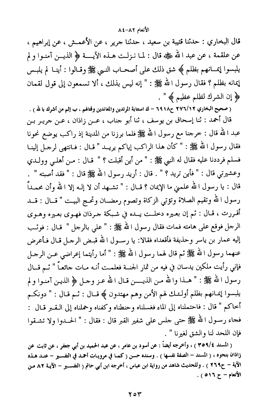 (المسند 4/359) ، وأخرجه أيضاً: عن أسود بن عامر، عن عبد الحميد بن أبي جعفر، عن ثابت عن زاذان بنحوه، (المسند- الصفة نفسها) . وسنده حسن (كما في مرويات أحمد في التفسير -عند هذه الآيه- ح 269) . وللحديث شاهد من رواية ابن عباس، أخرجه ابن أبي حاتم (التفسير - الآيه 82 من الأنعام - ح 516) .
