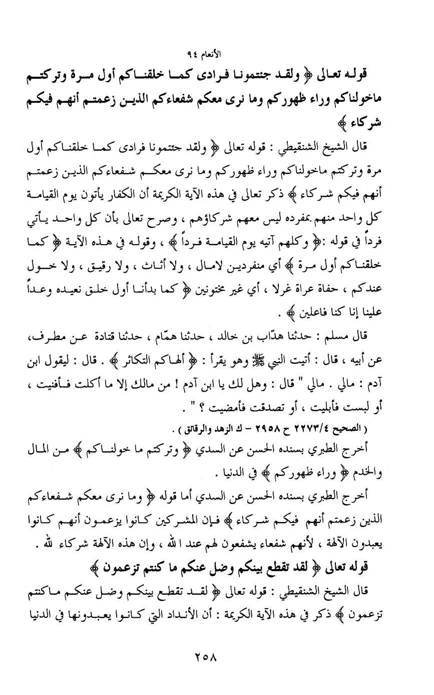 قال الشيخ الشنقيطي: قوله تعالى (ولقد جئتمونا فرادى كما خلقناكم أول مرة وتركتم ماخولناكم وراء ظهوركم وما نرى معكم شفعاءكم الذين زعمتم أنهم فيكم شركاء) ذكر تعالى في هذه الآية الكريمة أن الكفار يأتون يوم القيامة كل واحد منهم بمفرده ليس معهم شركاؤهم، وصرح تعالى بأن كل واحد يأتي فرداً في قوله: (وكلهم آتيه يوم القيامة فرداً) وقوله في هذه الآية (كما خلقناكم أول مرة) أي منفردين لامال، ولا أثاث، ولا رقيق، ولا خول عندكم، حفاة عراة غرلا، أي غير مختونين (كما بدأنا أول خلق نعيده وعداً علينا إنا كنا فاعلين) .