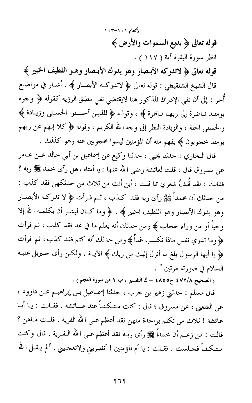 قال البخاري: حدثنا يحيى، حدثنا وكيع عن إسماعيل بن أبي خالد عن عامر عن مسروق قال: قلت لعائشة رضي الله عنها: يا أمتاه، هل رأى محمد - صَلَّى اللَّهُ عَلَيْهِ وَسَلَّمَ - ربه؟