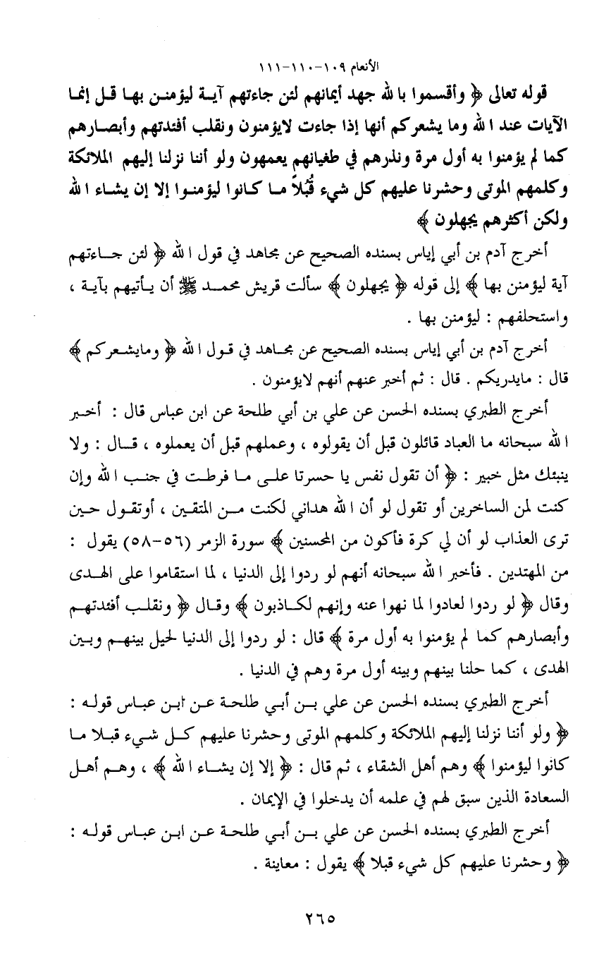 أخرج الطبري بسنده الحسن عن علي بن أبي طلحة عن ابن عباس قوله: (ولو أننا نزلنا إليهم الملائكة وكلمهم الموتى وحشرنا عليهم كل شيء قبلا ما كانوا ليؤمنوا) وهم أهل الشقاء، ثم قال: (إلا إن يشاء الله) ، وهم أهل السعادة الذين سبق لهم في علمه أن يدخلوا في الإيمان.