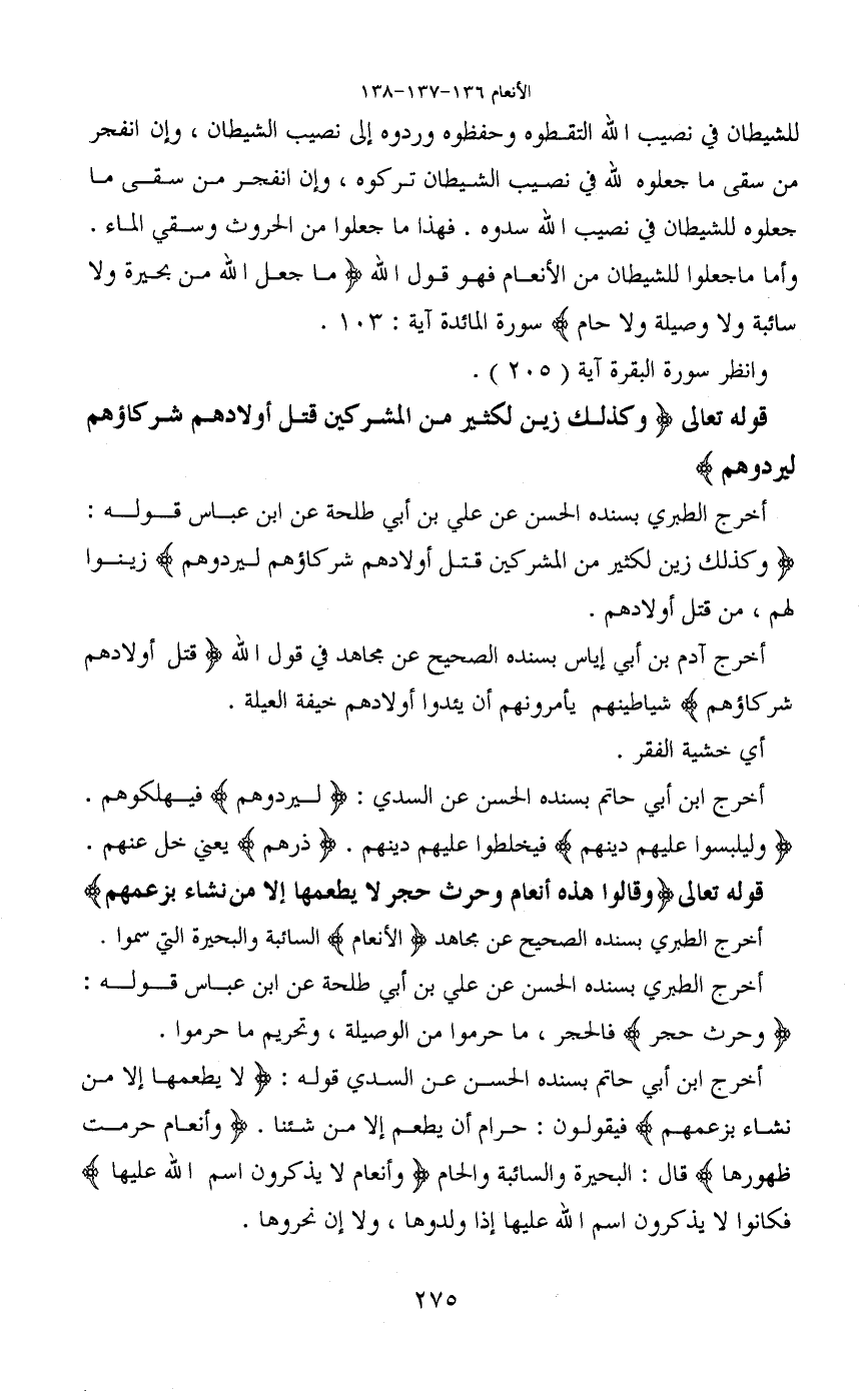 أخرج ابن أبي حاتم بسنده الحسن عن السدي قوله: (لا يطعمها إلا من نشاء بزعمهم) فيقولون: حرام أن يطعم إلا من شئنا. (وأنعام حرمت ظهورها) قال: البحيرة والسائبة والحام (وأنعام لا يذكرون اسم الله عليها) فكانوا لا يذكرون اسم الله عليها إذا ولدوها، ولا إن نحروها.