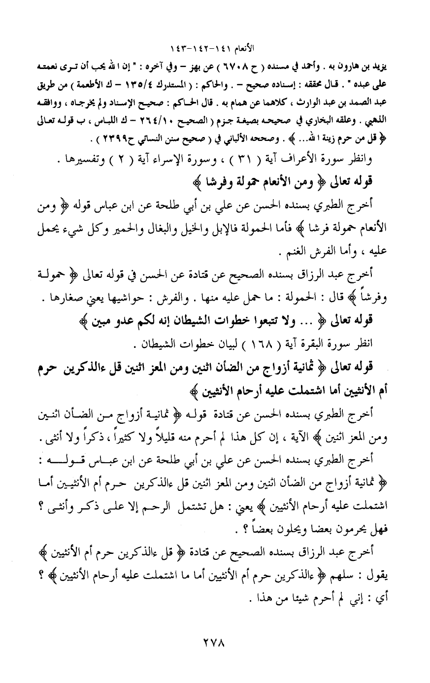 أخرج عبد الرزاق بسنده الصحيح عن قتادة (قل ءالذكرين حرم أم الأنثيين) يقول: سلهم (ءالذكرين حرم أم الأنثيين أما ما اشتملت عليه أرحام الأنثيين) ؟ أي: إني لم أحرم شيئا من هذا.