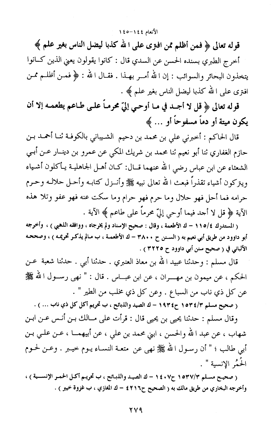 قال الحاكم: أخبرني علي بن محمد بن دحيم الشيباني بالكوفة ثنا أحمد بن حازم الغفاري ثنا أبو نعيم ثنا محمد بن شريك المكي عن عمرو بن دينار عن أبي الشعثاء عن ابن عباس رضي الله عنهما قال: كان أهل الجاهلية يأكلون أشياء ويتركون أشياء تقذراً فبعث الله تعالى نبيه - صَلَّى اللَّهُ عَلَيْهِ وَسَلَّمَ - وأنزل كتابه وأحل حلاله وحرم حرامه فما أحل فهو حلال وما حرم فهو حرام وما سكت عنه فهو عفو وتلا هذه الآية (قل لا أجد فيما أوحي إلي محرماً على طاعم) الآية.