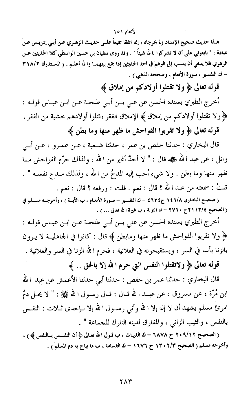 قال البخاري: حدثنا عمر بن حفص: حدثنا أبي حدثنا الأعمش عن عبد الله ابن مُرّة، عن مسروق، عن عبد الله قال: قال رسول الله - صَلَّى اللَّهُ عَلَيْهِ وَسَلَّمَ -: "لا يحل دمُ امرئ مسلم يشهد أن لا إله إلا الله وأني رسول الله إلا بإحدى ثلاث: النفس بالنفس، والثيب الزاني، والمفارق لدينه التارك للجماعة".