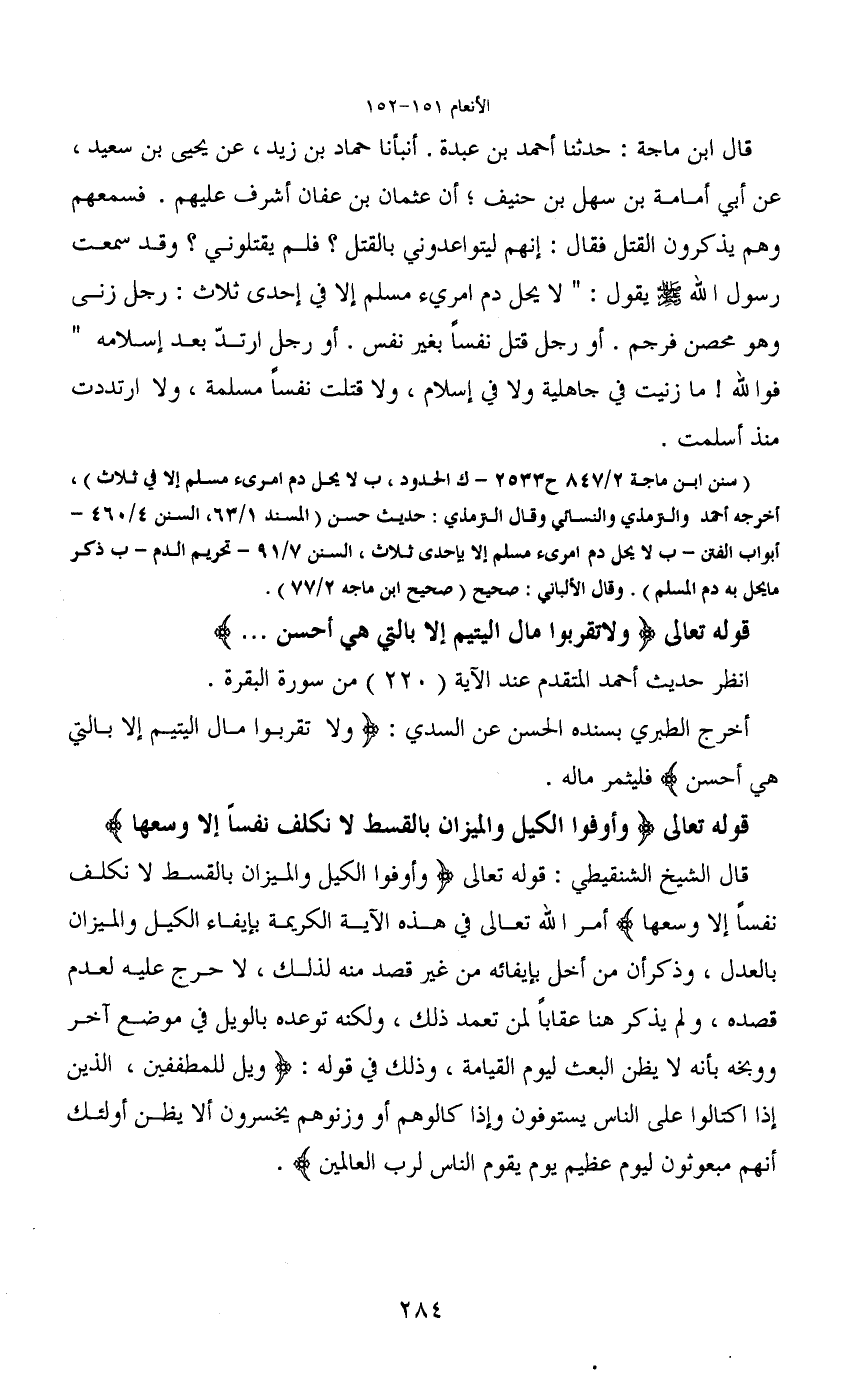قال الشيخ الشنقيطي: قوله تعالى (وأوفوا الكيل والميزان بالقسط لا نكلف نفساً إلا وسعها) أمر الله تعالى في هذه الآية الكريمة بإيفاء الكيل والميزان بالعدل، وذكر أن من أخل بإيفائه من غير قصد منه لذلك، لا حرج عليه لعدم قصده، ولم يذكر هنا عقاباً لمن تعمد ذلك، ولكنه توعده بالويل في موضع آخر ووبخه بأنه لا يظن البعث ليوم القيامة، وذلك في قوله: (ويل للمطففين، الذين إذا اكتالوا على الناس يستوفون وإذا كالوهم أو وزنوهم يخسرون ألا يظن أولئك أنهم مبعوثون ليوم عظيم يوم يقوم الناس لرب العالمين) .