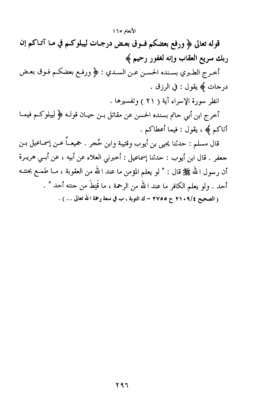 قال مسلم: حدثنا يحيى بن أيوب وقتيبة وابن حُجر. جميعاً عن إسماعيل بن جعفر. قال ابن أيوب: حدثنا إسماعيل: أخبرني العلاء عن أبيه، عن أبي هريرة أن رسول الله - صَلَّى اللَّهُ عَلَيْهِ وَسَلَّمَ - قال: "لو يعلم المؤمن ما عند الله من العقوبة، ما طمع بجنته أحد. ولو يعلم الكافر ما عند الله من الرحمة، ما قَنِطَ من جنته أحد".
