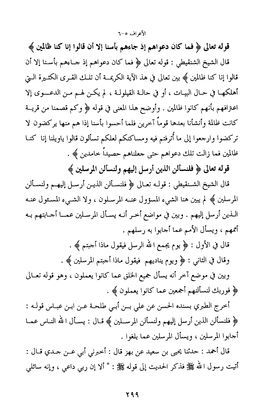 قال الشيخ الشنقيطي: قوله تعالى (فلنسألن الذين أرسل إليهم ولنسألن المرسلين) لم يبين هنا الشيء المسؤول عنه المرسلون، ولا الشيء المسئول عنه الذين أرسل إليهم. وبين في مواضع أخر أنه يسأل المرسلين عما أجابتهم به أممهم، ويسأل الأمم عما أجابوا به رسلهم.