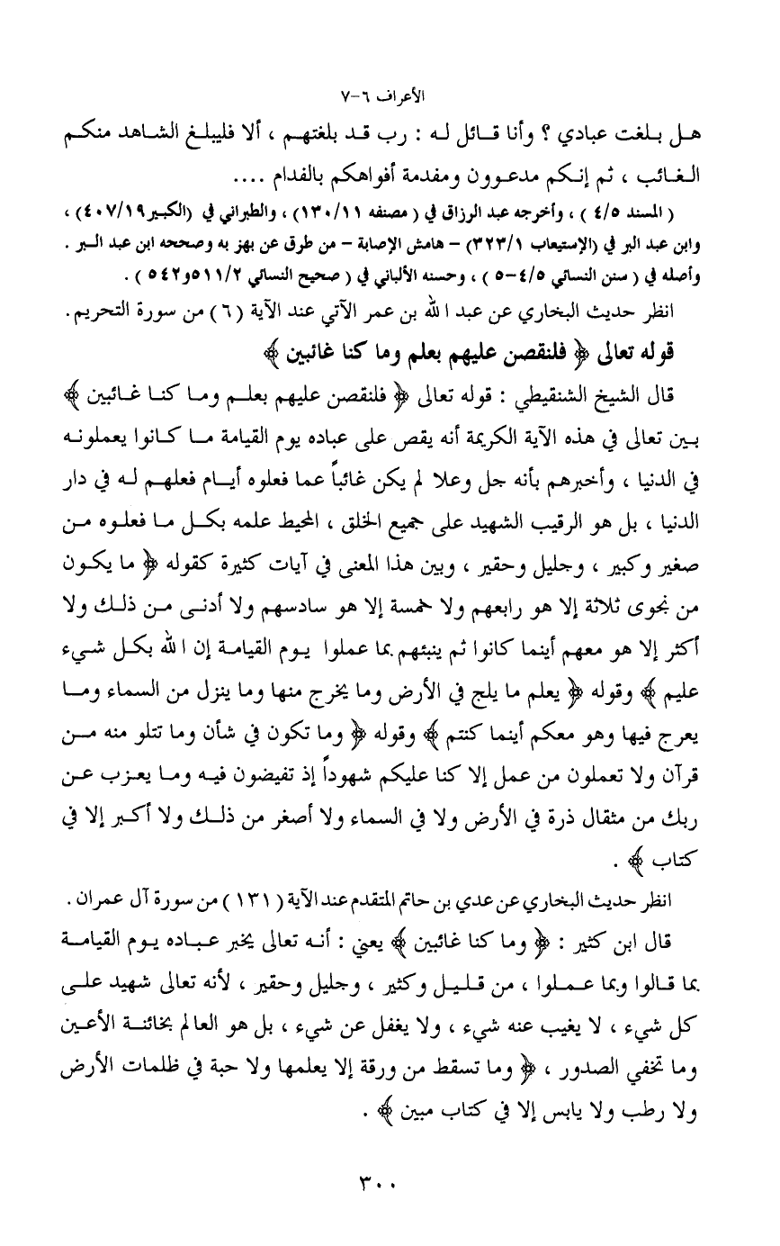 قال الشيخ الشنقيطي: قوله تعالى (فلنقصن عليهم بعلم وما كنا غائبين) بين تعالى في هذه الآية الكريمة أنه يقص على عباده يوم القيامة ما كانوا يعملونه في الدنيا، وأخبرهم بأنه جل وعلا لم يكن غائباً عما فعلوه أيام فعلهم له في دار الدنيا، بل هو الرقيب الشهيد على جميع الخلق، المحيط علمه بكل ما فعلوه من صغير وكبير، وجليل وحقير، وبين هذا المعنى في آيات كثيرة كقوله (ما يكون من نجوى ثلاثة إلا هو رابعهم ولا خمسة إلا هو سادسهم ولا أدنى من ذلك ولا أكثر إلا هو معهم أينما كانوا ثم ينبئهم بما عملوا يوم القيامة إن الله بكل شيء عليم) وقوله (يعلم ما يلج في الأرض وما يخرج منها وما ينزل من السماء وما يعرج فيها وهو معكم أينما كنتم) وقوله (وما تكون في شأن وما تتلو منه من قرأن ولا تعملون من عمل إلا كنا عليكم شهوداً إذ تفيضون فيه وما يعزب عن ربك من مثقال ذرة في الأرض ولا في السماء ولا أصغر من ذلك ولا أكبر إلا في كتاب) .