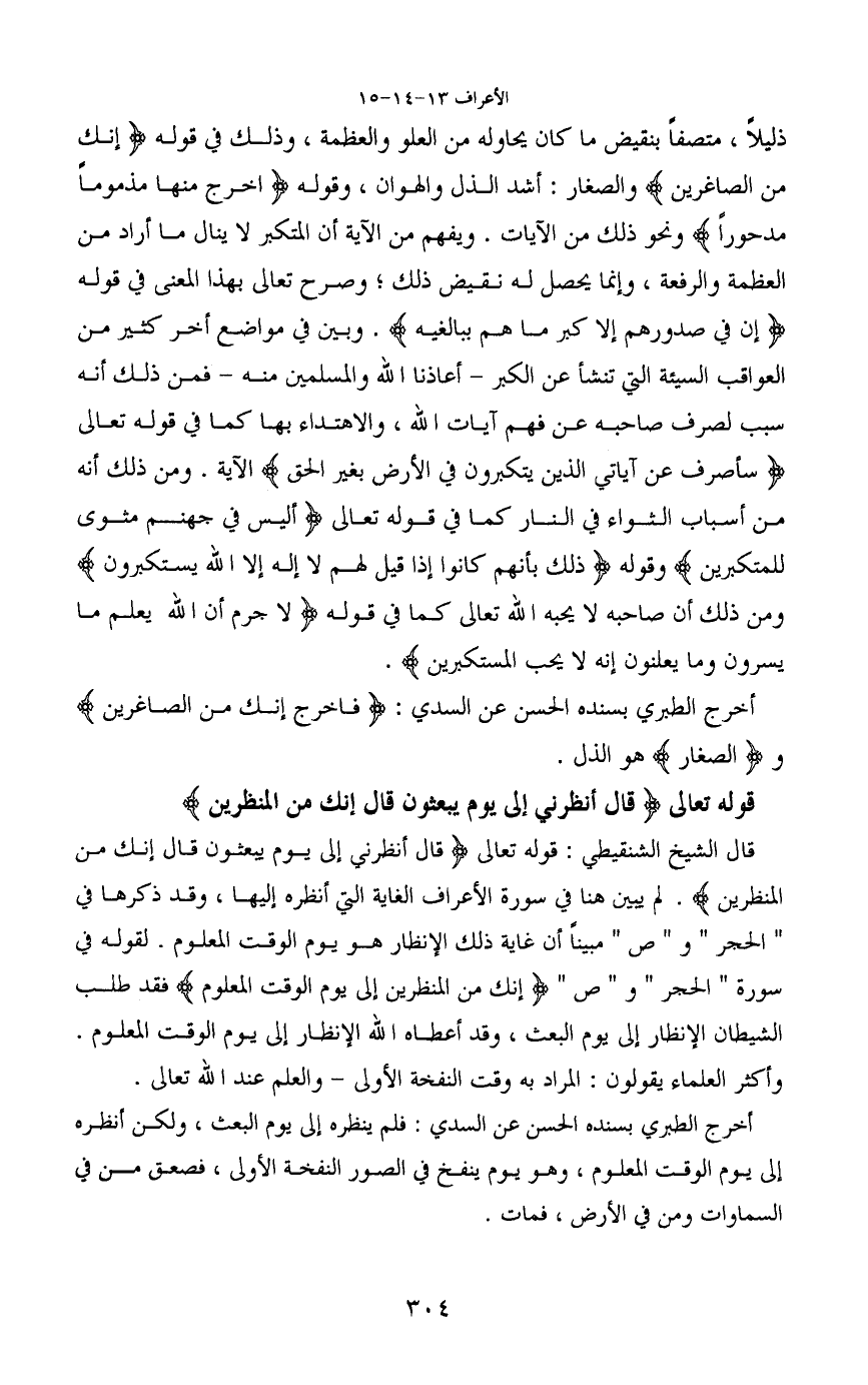 ذليلاً، متصفاً بنقيض ما كان يحاوله من العلو والعظمة، وذلك في قوله (إنك من الصاغرين) والصغار: أشد الذل والهوان، وقوله (اخرج منها مذموماً مدحوراً) ونحو ذلك من الآيات. ويفهم من الآية أن المتكبر لا ينال ما أراد من العظمة والرفعة، وإنما يحصل له نقيض ذلك؛ وصرح تعالى بهذا المعنى في قوله (إن في صدورهم إلا كبر ما هم ببالغيه) . وبين في مواضع أخر كثير من العواقب السيئة التي تنشأ عن الكبر -أعاذنا الله والمسلمين منه- فمن ذلك أنه سبب لصرف صاحبه عن فهم آيات الله، والاهتداء بها كما في قوله تعالى (سأصرف عن آياتي الذين يتكبرون في الأرض بغير الحق) الآية. ومن ذلك أنه من أسباب الثواء في النار كما في قوله تعالى (أليس في جهنم مثوى للمتكبرين) وقوله (ذلك بأنهم كانوا إذا قيل لهم لا إله إلا الله يستكبرون) ومن ذلك أن صاحبه لا يحبه الله تعالى كما في قوله (لا جرم أن الله يعلم ما يسرون وما يعلنون إنه لا يحب المستكبرين) .