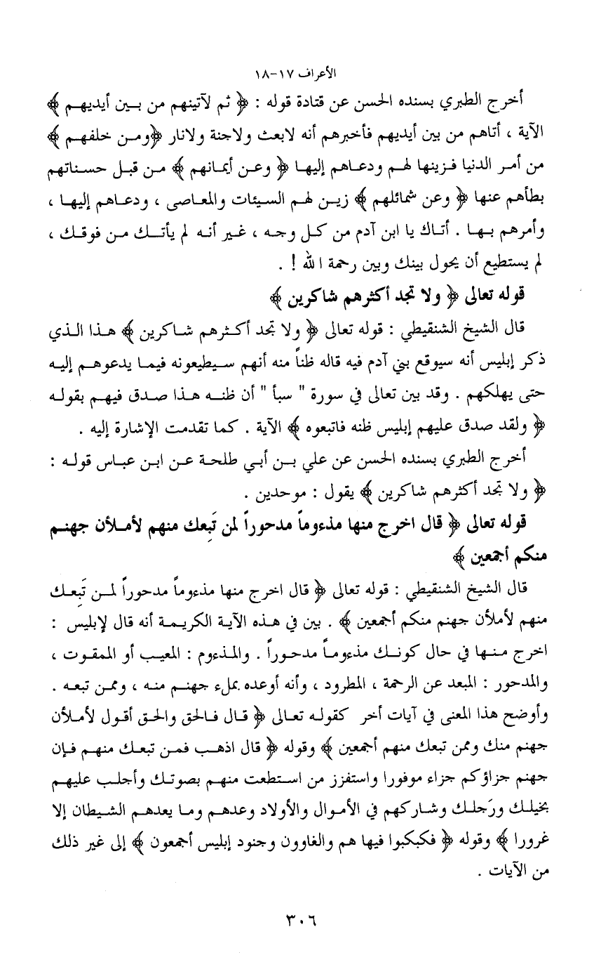 قال الشيخ الشنقيطي: قوله تعالى (قال اخرج منها مذءوماً مدحوراً لمن تَبِعك منهم لأملأن جهنم منكم أجمعين) . بين في هذه الآية الكريمة أنه قال لإبليس: اخرج منها في حال كونك مذءوماً مدحوراً. والمذءوم: المعيب أو الممقوت، والمدحور: المبعد عن الرحمة، المطرود، وأنه أوعده بملء جهنم منه، وممن تبعه.