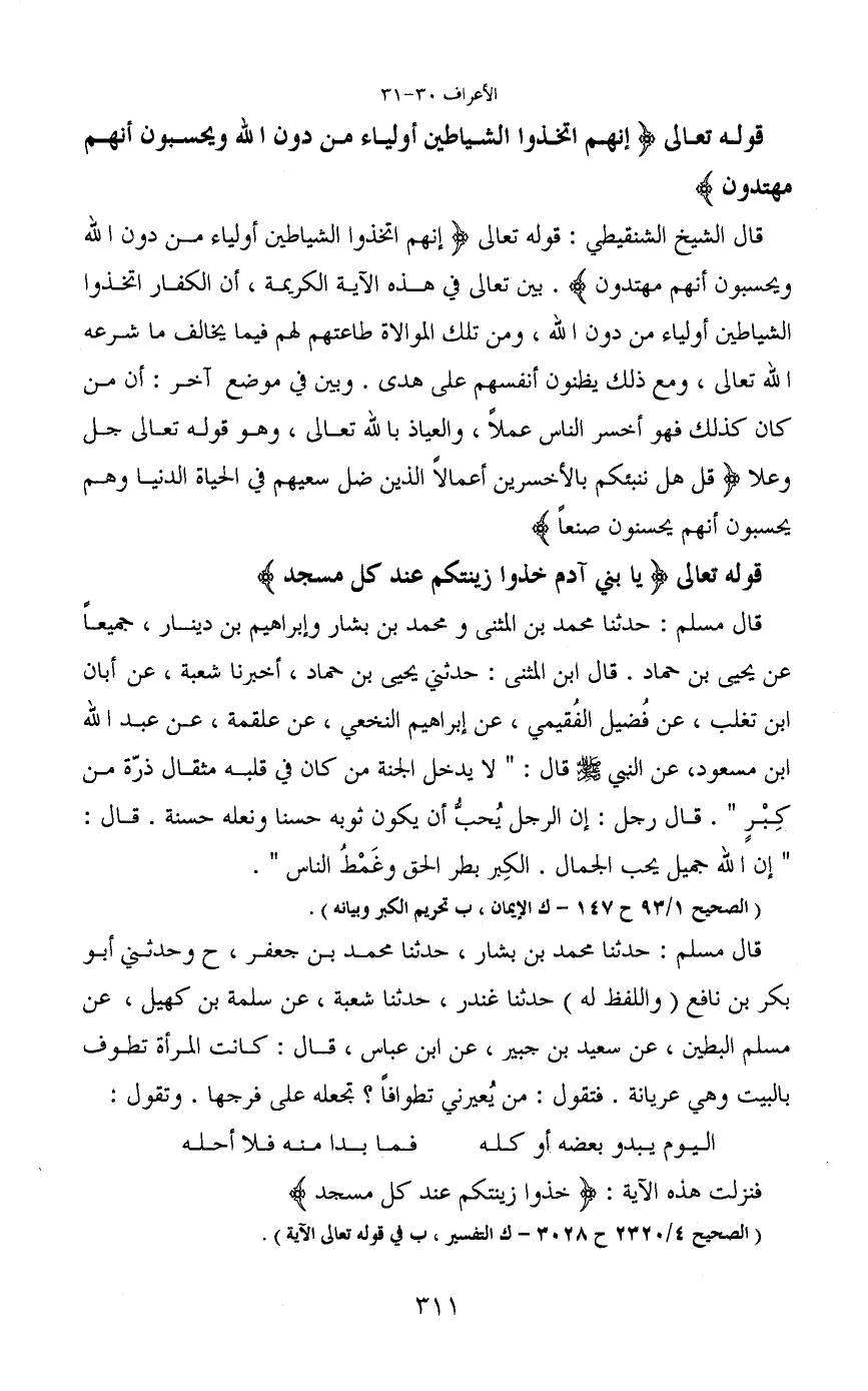 قال مسلم: حدثنا محمد بن المثنى ومحمد بن بشار وإبراهيم بن دينار، جميعاً عن يحيى بن حماد. قال ابن المثنى: حدثى يحيى بن حماد، أخبرنا شعبة، عن أبان ابن تغلب، عن فُضيل الفقيمي، عن إبراهيم النخعي، عن علقمة، عن عبد الله ابن مسعود، عن النبي - صَلَّى اللَّهُ عَلَيْهِ وَسَلَّمَ - قال: "لا يدخل الجنة من كان في قلبه مثقال ذرّة من كبرٍ". قال رجل: "إن الرجل يُحب أن يكون ثوبه حسنا ونعله حسنة. قال: "إن الله جميل يحب الجمال. الكِبر بطر الحق وغَمْط الناس".