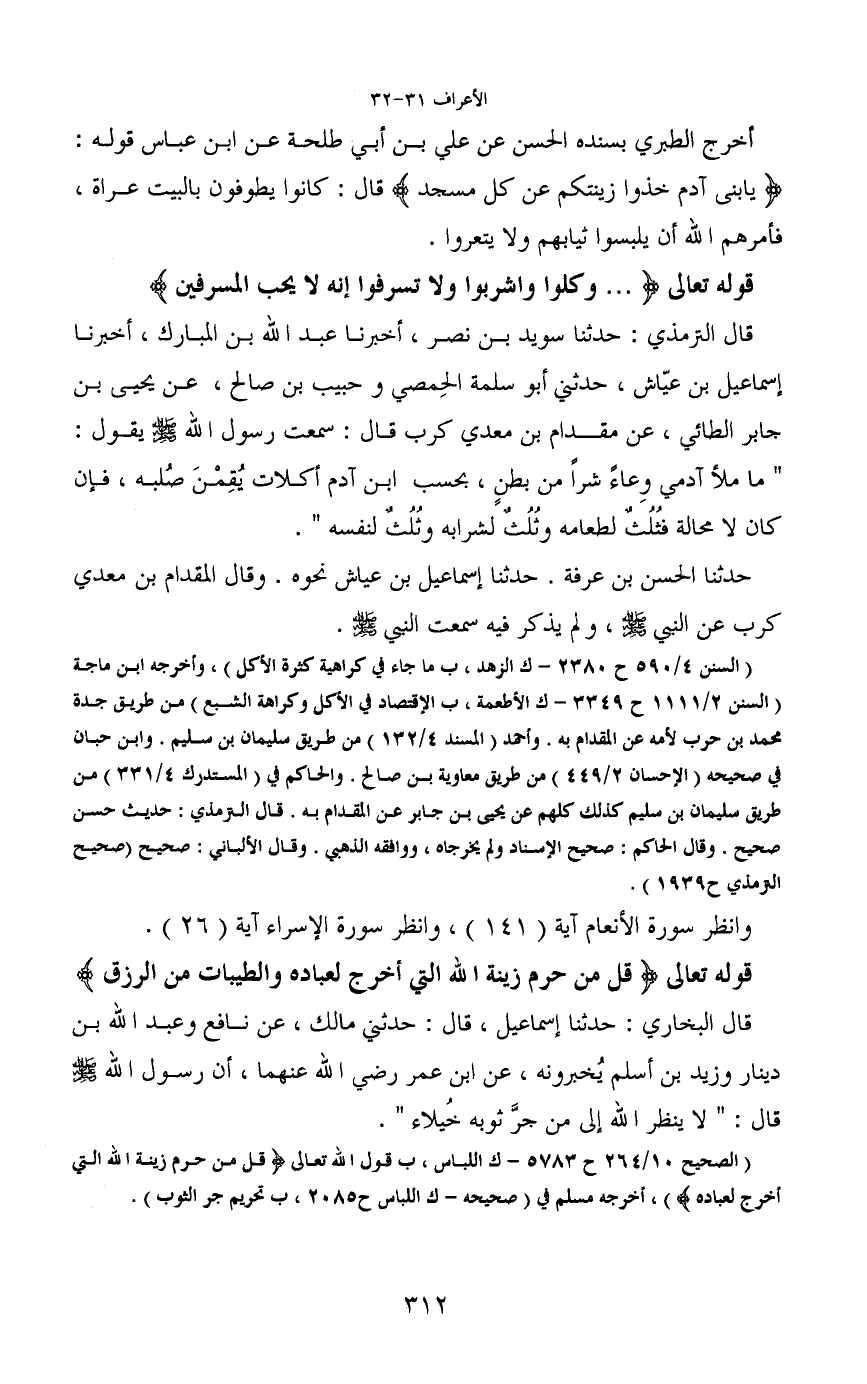 قال الترمذي: حدثنا سويد بن نصر، أخبرنا عبد الله بن المبارك، أخبرنا إسماعيل بن عيّاش، حدثني أبو سلمة الحِمصي وحبيب بن صالح، عن يحيى بن جابر الطائي، عن مقدام بن معدي كرب قال: سمعت رسول الله - صَلَّى اللَّهُ عَلَيْهِ وَسَلَّمَ - يقول: "ما ملأ آدمي وِعاء شراً من بطنٍ، بحسب ابن آدم أكلات يُقِمْنَ صُلبه، فإن كان لا محالة فثلثْ لطعامه وثلث لشرابه وثلُث لنفسه".