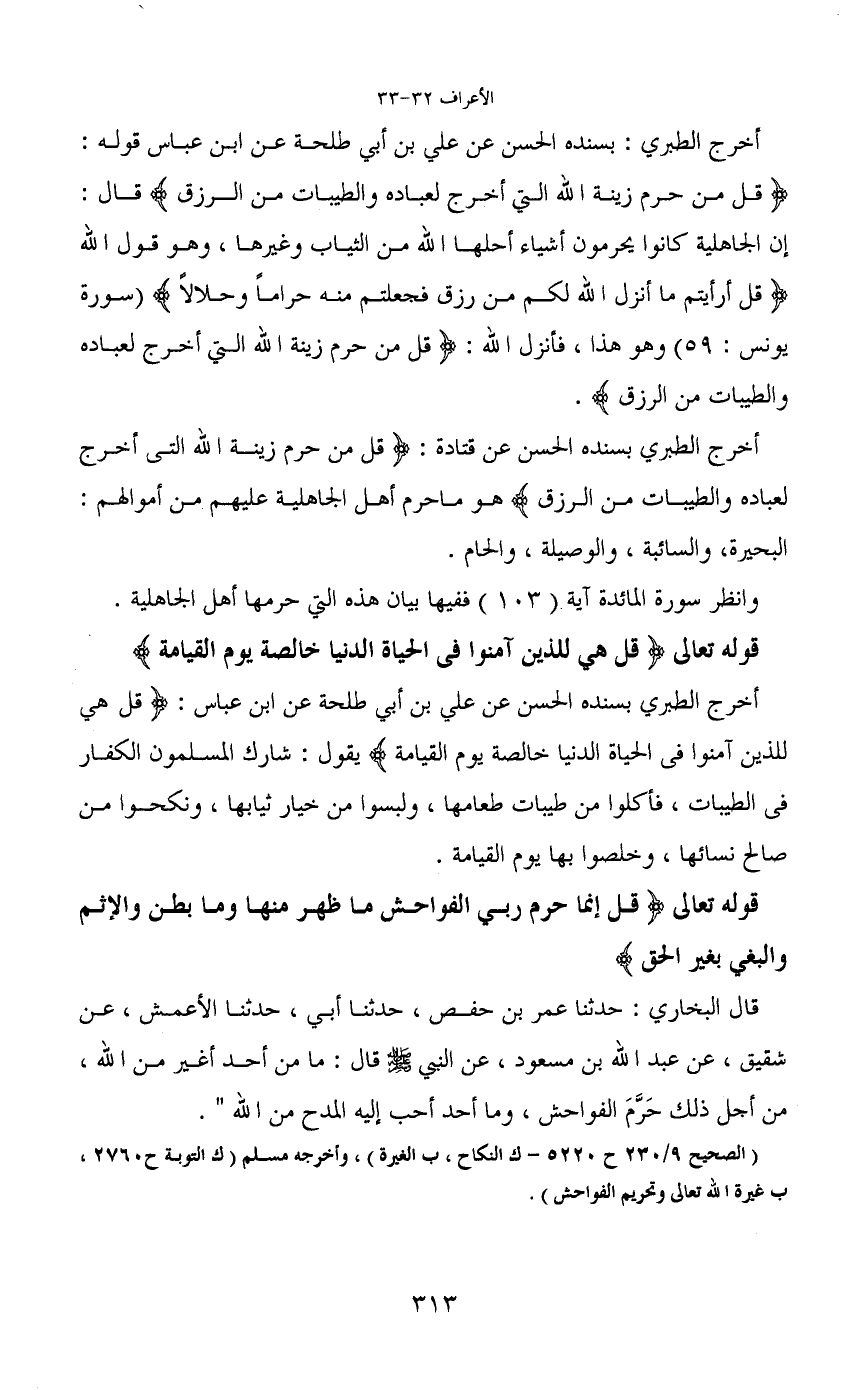 أخرج الطبري بسنده الحسن عن قتادة: (قل من حرم زينة الله التى أخرج لعباده والطيبات من الرزق) هو ما حرم أهل الجاهلية عليهم من أموالهم: البحيرة، والسائبة، والوصيلة، والحام.