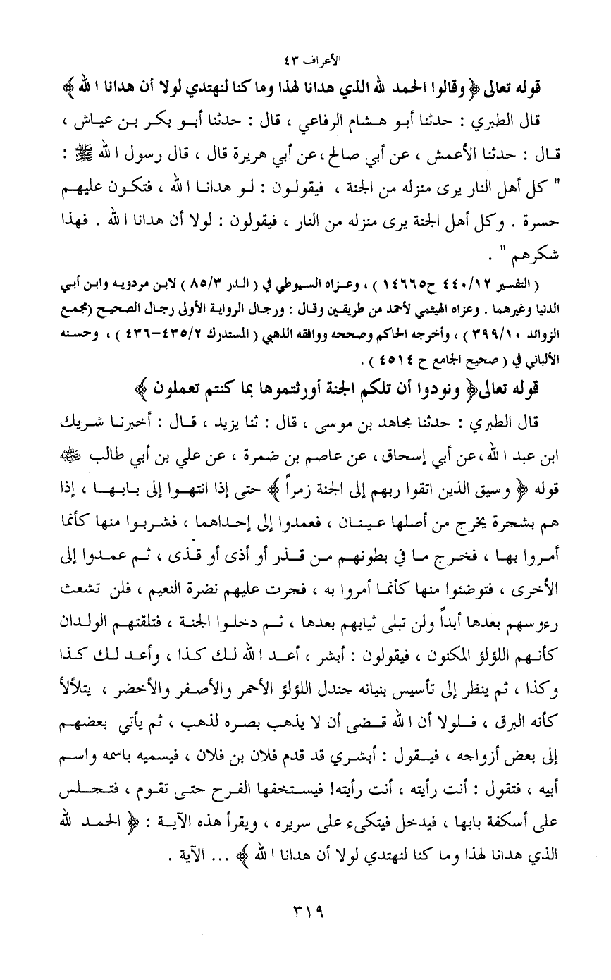 قال الطبري: حدثنا أبو هشام الرفاعي، قال: حدثنا أبو بكر بن عياش، قال: حدثنا الأعمش، عن أبي صالح، عن أبي هريرة قال، قال رسول الله - صَلَّى اللَّهُ عَلَيْهِ وَسَلَّمَ -: "كل أهل النار يرى منزله من الجنة، فيقولون: لو هدانا الله، فتكون عليهم حسرة. وكل أهل الجنة يرى منزله من النار، فيقولون: لولا أن هدانا الله. فهذا شكرهم".