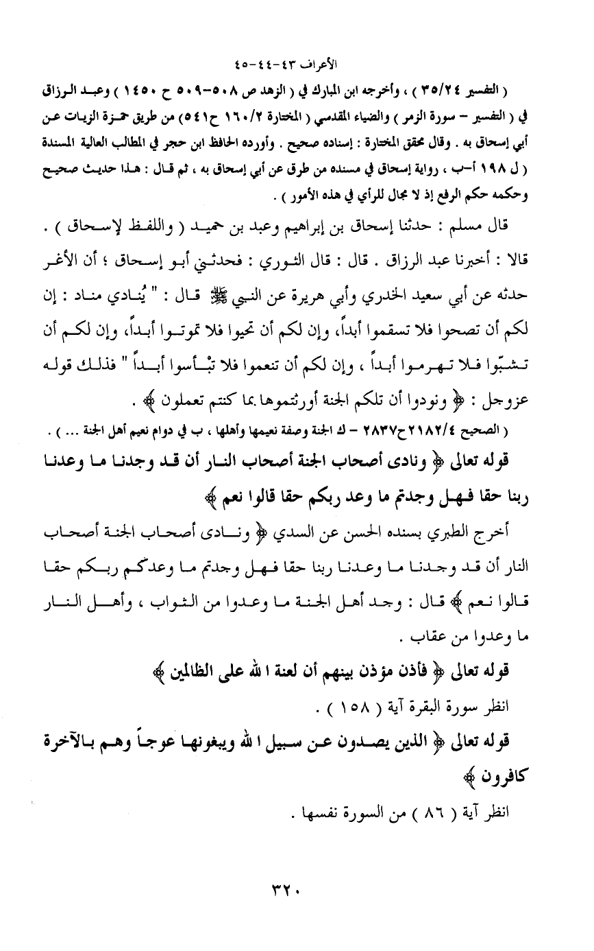 قالا: أخبرنا عبد الرزاق. قال: قال الثوري: فحدثني أبو إسحاق؛ أن الأغر حدثه عن أبي سعيد الخدري وأبى هريرة عن النبي - صَلَّى اللَّهُ عَلَيْهِ وَسَلَّمَ - قال: "يُنادي مناد: إن لكم أن تصحوا فلا تسقموا أبداً، وإن لكم أن تحيوا فلا تموتوا أبداً، وإن لكم أن تشبّوا فلا تهرموا أبداً، وإن لكم أن تنعموا فلا تبْأسوا أبداً" فذلك قوله عز وجل: (ونودوا أن تلكم الجنة أورثتموها بما كنتم تعملون) .