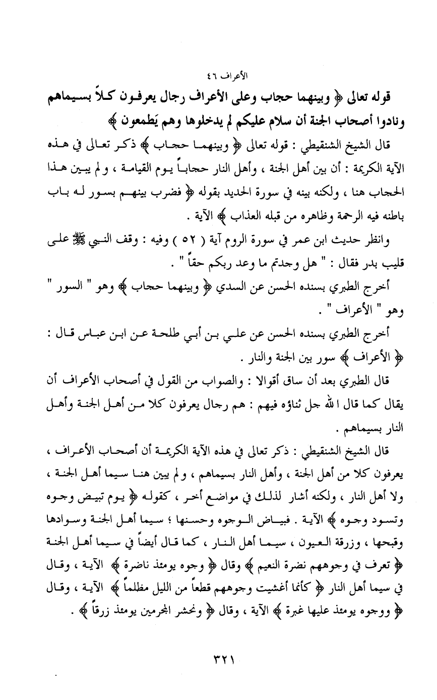 أخرج الطبري بسنده الحسن عن علي بن أبي طلحة عن ابن عباس قال: (الأعراف) سور بين الجنة والنار.