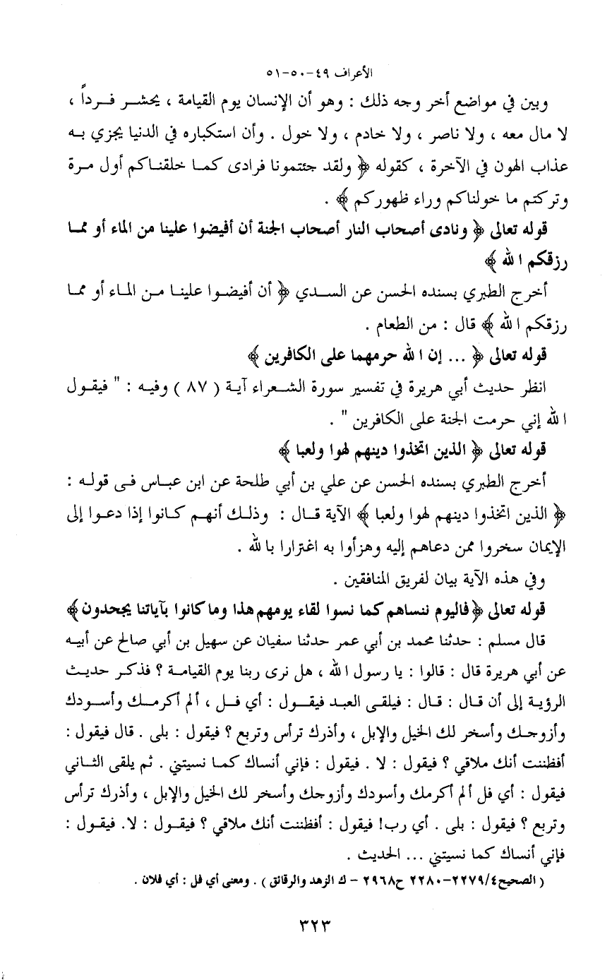 قال مسلم: حدثنا محمد بن أبي عمر حدثنا سفيان عن سهيل بن أبي صالح عن أبيه عن أبي هريرة قال: قالوا: يا رسول الله، هل نرى ربنا يوم القيامة؟ فذكر حديث الرؤية إلى أن قال: قال: فيلقى العبد فيقول: أي فل، ألم أكرمك وأسودك وأزوجك وأسخر لك الخيل والإبل، وأذرك ترأس وتربع؟ فيقول: بلى، قال فيقول: أفظننت أنك ملاقي؟ فيقول: لا. فيقول فإني أنساك كما نسيتني. ثم يلقى الثاني فيقول: أي فل ألم أكرمك وأسودك وأزوجك وأسخر لك الخيل والإبل، وأذرك ترأس وتربع؟ فيقول: بلى. أي رب! فيقول: أفظننت أنك ملاقي؟ فيقول: لا. فيقول: فإني أنساك كما نسيتني ... الحديث.