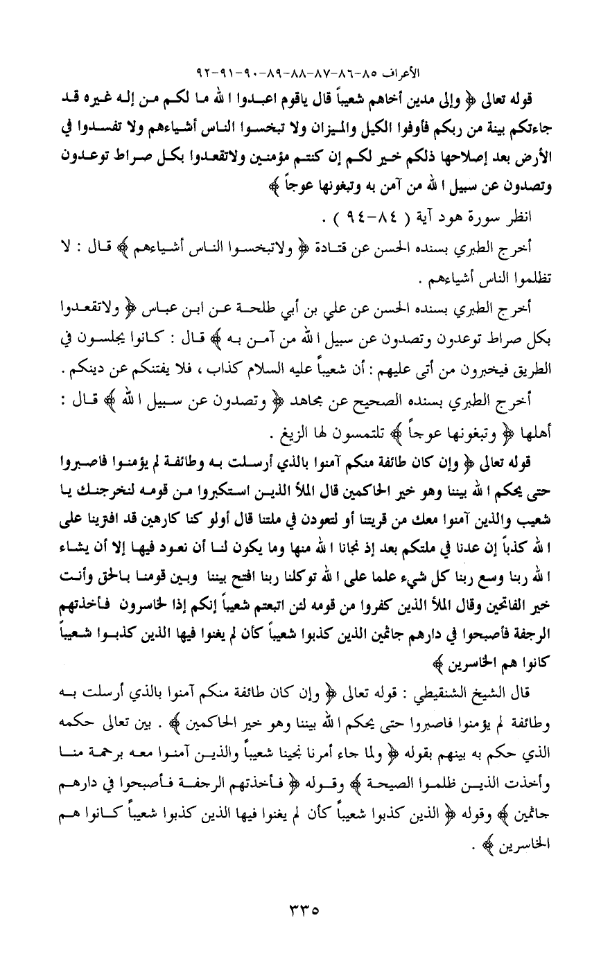قوله تعالى (وإلى مدين أخاهم شعيباً قال يا قوم اعبدوا الله ما لكم من إله غيرة قد جاءتكم بينة من ربكم فأوفوا الكيل والميزان ولا تبخسوا الناس أشياءهم ولا تفسدوا في الأرض بعد إصلاحها ذلكم خير لكم إن كنتم مؤمنين ولا تقعدوا بكل صراط توعدون وتصدون عن سبيل الله من آمن به وتبغونها عوجاً)