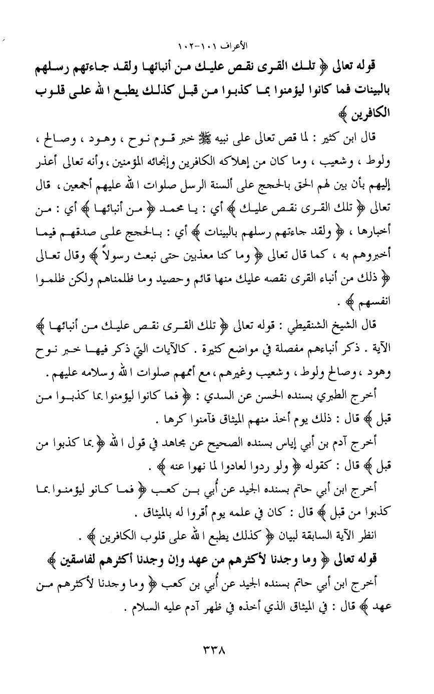 قال الشيخ الشنقيطي: قوله تعالى (تلك القرى نقص عليك من أنبائها) الآية. ذكر أنباءهم مفصلة في مواضع كثيرة. كالآيات التى ذكر فيها خبر نوح وهود، وصالح ولوط، وشعيب وغيرهم، مع أممهم صلوات الله وسلامه عليهم.