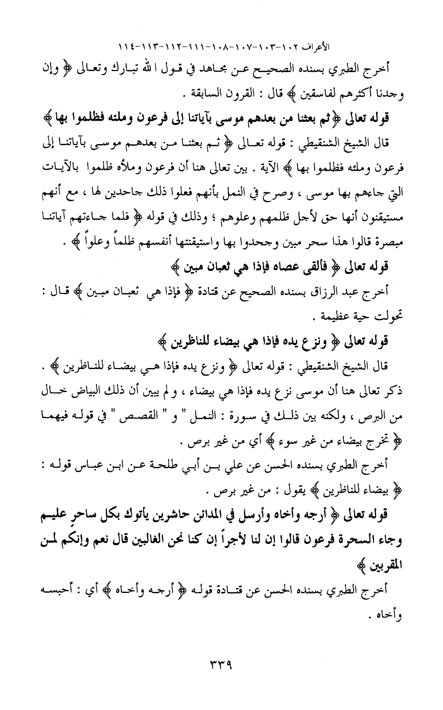 قال الشيخ الشنقيطي: قوله تعالى (ثم بعثنا من بعدهم موسى بآياتنا إلى فرعون وملئه فظلموا بها) الآية. بين تعالى هنا أن فرعون وملأه ظلموا بالآيات التي جاءهم بها موسى، وصرح في النمل بأنهم فعلوا ذلك جاحدين لها، مع أنهم مستيقنون أنها حق لأجل ظلمهم وعلوهم؛ وذلك في قوله (فلما جاءتهم آياتنا مبصرة قالوا هذا سحر مبين وجحدوا بها واستيقنتها أنفسهم ظلماً وعلواً) .