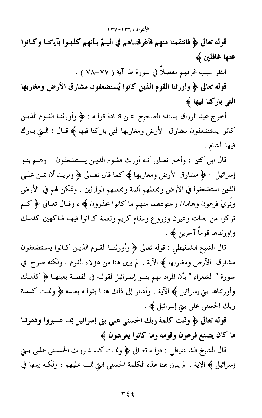 قال الشيخ الشنقيطي: قوله تعالى (وأورثنا القوم الذين كانوا يستضعفون مشارق الأرض ومغاربها) الآية. لم يبين هنا من هؤلاء القوم، ولكنه صرح في سورة "الشعراء" بأن المراد بهم بنو إسرائيل لقوله في القصة بعينها (كذلك وأورثناها بني إسرائيل) الآية، وأشار إلى ذلك هنا بقوله بعده (وتمت كلمة ربك الحسنى على بني إسرائيل) .