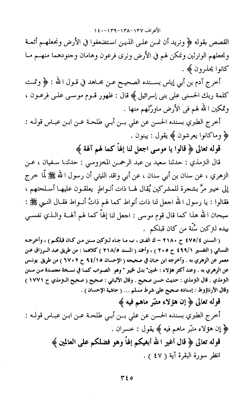 قال الترمذي: حدثنا سعيد بن عبد الرحمن المخزومي: حدثنا سفيان، عن الزهري، عن سنان بن أبي سنان، عن أبي واقد الليثي أن رسول الله - صَلَّى اللَّهُ عَلَيْهِ وَسَلَّمَ - لمّا خرج إلى خيبر مرَّ بشجرة للمشركين يُقال لها ذات أنواطٍ يعلقون عليها أسلحتهم، فقالوا: يا رسول الله اجعل لنا ذات أنواط كما لهم ذاتُ أنواط فقال النبي - صَلَّى اللَّهُ عَلَيْهِ وَسَلَّمَ -: سبحان الله هذا كما قال قوم موسى: اجعل لنا إلهاً كما لهم آلهة والذي نفسي بيده لتركبن سُنّة من كان قبلكم.