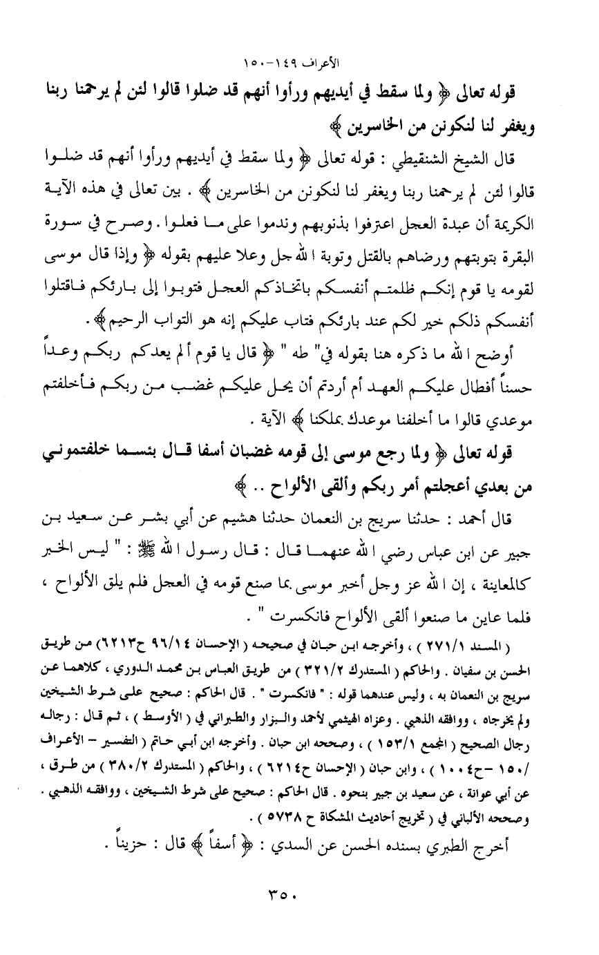 قال الشيخ الشنقيطي: قوله تعالى (ولما سقط في أيديهم ورأوا أنهم قد ضلوا قالوا لئن لم يرحمنا ربنا ويغفر لنا لنكونن من الخاسرين) . بين تعالى في هذه الآية الكريمة أن عبدة العجل اعترفوا بذنوبهم وندموا على ما فعلوا. وصرح في سورة البقرة بتوبتهم ورضاهم بالقتل وتوبة الله جل وعلا عليهم بقوله (وإذا قال موسى لقومه يا قوم إنكم ظلمتم أنفسكم باتخاذكم العجل فتوبوا إلى بارئكم فاقتلوا أنفسكم ذلكم خير لكم عند بارئكم فتاب عليكم إنه هو التواب الرحيم) .