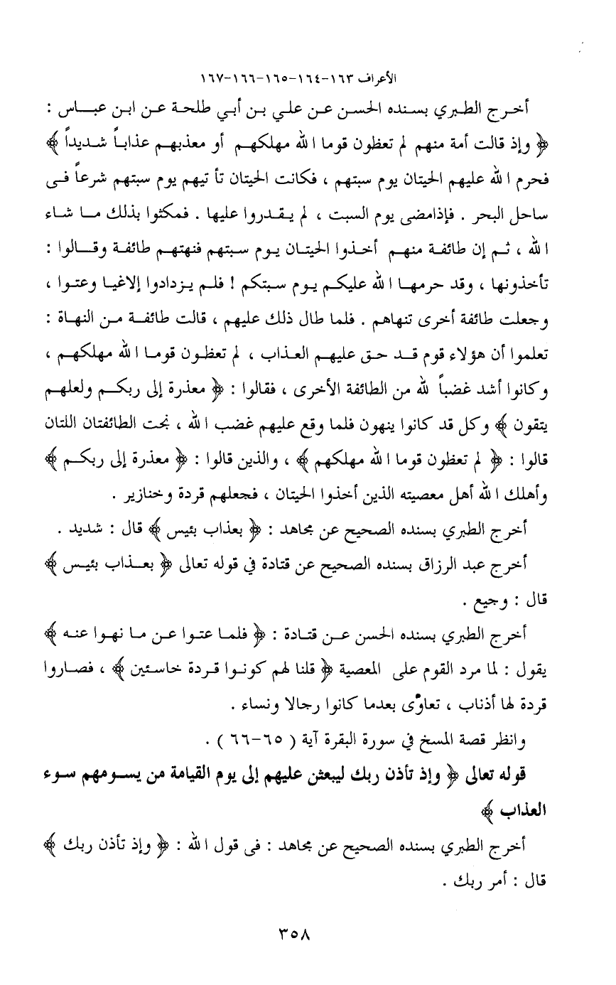 أخرج الطبري بسنده الحسن عن علي بن أبي طلحة عن ابن عباس: (وإذ قالت أمة منهم لم تعظون قوما الله مهلكهم أو معذبهم عذاباً شديداً) فحرم الله عليهم الحيتان يوم سبتهم، فكانت الحيتان تأتيهم يوم سبتهم شرعاً في ساحل البحر. فإذا مضى يوم السبت، لم يقدروا عليها. فمكثوا بذلك ما شاء الله، ثم إن طائفة منهم أخذوا الحيتان يوم سبتهم فنهتهم طائفة وقالوا: تأخذونها، وقد حرمها الله عليكم يوم سبتكم! فلم يزدادوا إلاغيا وعتوا، وجعلت طائفة أخرى تنهاهم. فلما طال ذلك عليهم، قالت طائفة من النهاة: تعلموا أن هؤلاء قوم قد حق عليهم العذاب، لم تعظون قوما الله مهلكهم، وكانوا أشد غضباً بالله من الطائفة الأخرى، فقالوا: (معذرة إلى ربكم ولعلهم يتقون) وكل قد كانوا ينهون فلما وقع عليهم غضب الله، نجت الطائفتان اللتان قالوا: (لم تعظون قوما الله مهلكهم) ، والذين قالوا: (معذرة إلى ربكم) وأهلك الله أهل معصيته الذين أخذوا الحيتان، فجعلهم قردة وخنازير.