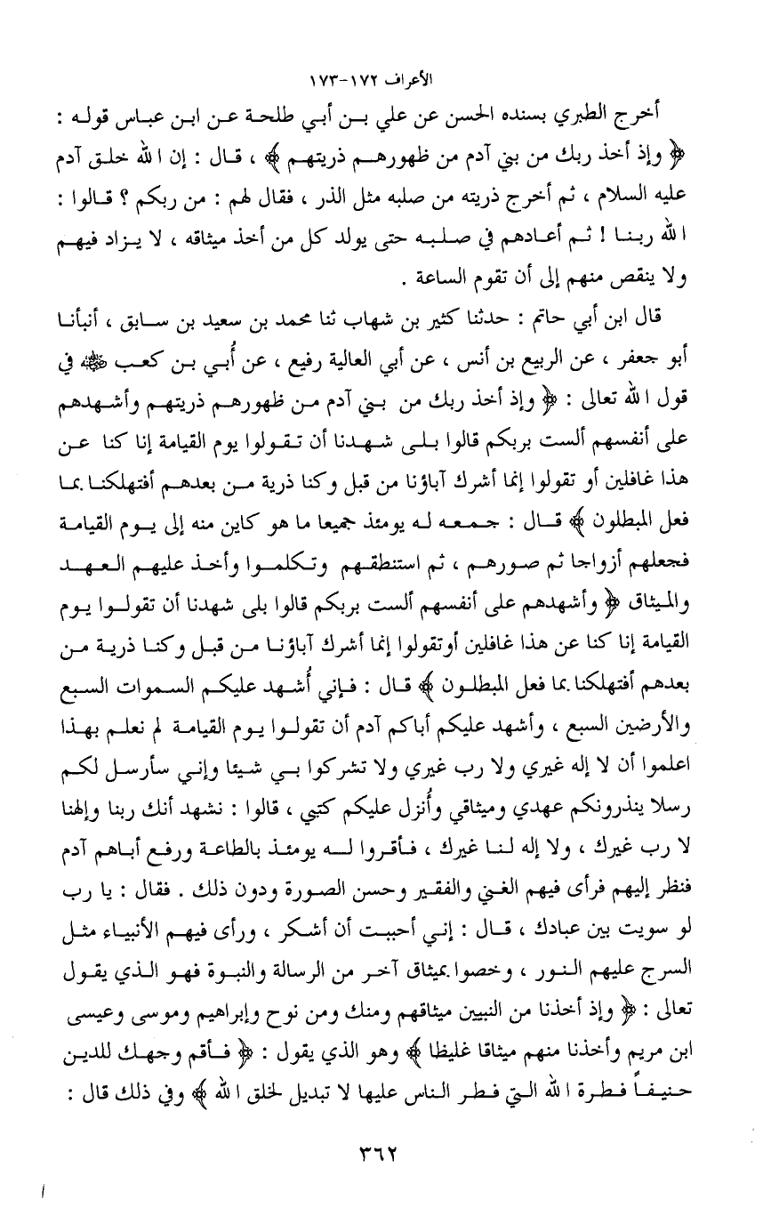 أخرج الطبري بسنده الحسن عن علي بن أبي طلحة عن ابن عباس قوله: (وإذ أخذ ربك من بني آدم من ظهورهم ذريتهم) ، قال: إن الله خلق آدم عليه السلام، ثم أخرج ذريته من صلبه مثل الذر، فقال لهم: من ربكم؟ قالوا: الله ربنا! ثم أعادهم في صلبه حتى يولد كل من أخذ ميثاقه، لا يزاد فيهم ولا ينقص منهم إلى أن تقوم الساعة.