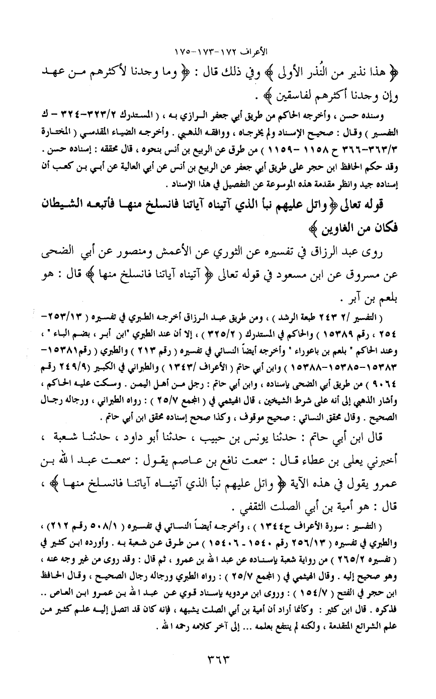 (التفسير/2 243 طبعة الرشد) ، ومن طريق عبد الرزاق أخرجه الطبري في تفسيره (13/253- 254، رقم 15389) والحاكم في المستدرك (2/325) ، إلا أن عند الطبري "ابن أبر، بضم الباء"، وعند الحاكم "بلعم بن باعوراء" وأخرجه أيضاً النسائي في تفسيره (رقم 213) والطبري (رقم 15381- 15383-15385-15388) وابن أبي حاتم (الأعراف 1343) والطبراني في الكبير (9/249 رقم 9064) من طريق أبى الضحى بإسناده، وابن أبي حاتم: رجل من أهل اليمن. وسكت عليه الحاكم، وأشار الذهبي إلى أنه على شرط الشيخين، قال الهيثمي في (المجمع 7/25) : رواه الطبراني، ورجاله رجال الصحيح. وقال محقق النسائي: صحيح موقوف، وكذا صحح إسناده محقق ابن أبي حاتم.