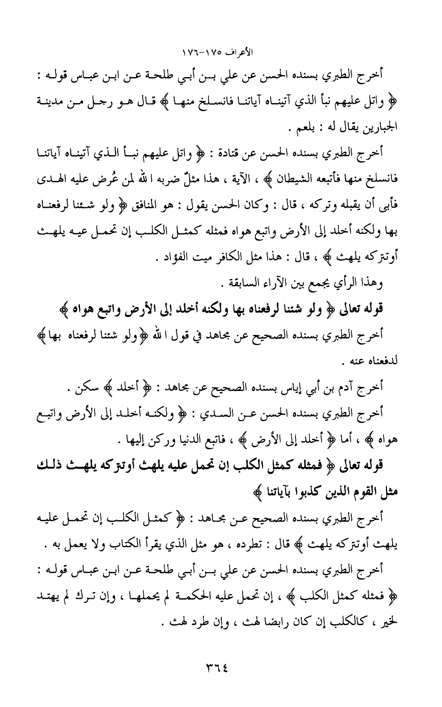 أخرج الطبري بسنده الحسن عن علي بن أبي طلحة عن ابن عباس قوله: (فمثله كمثل الكلب) ، إن تحمل عليه الحكمة لم يحملها، وإن ترك لم يهتد لخير، كالكلب إن كان رابضا لهث، وإن طرد لهث.