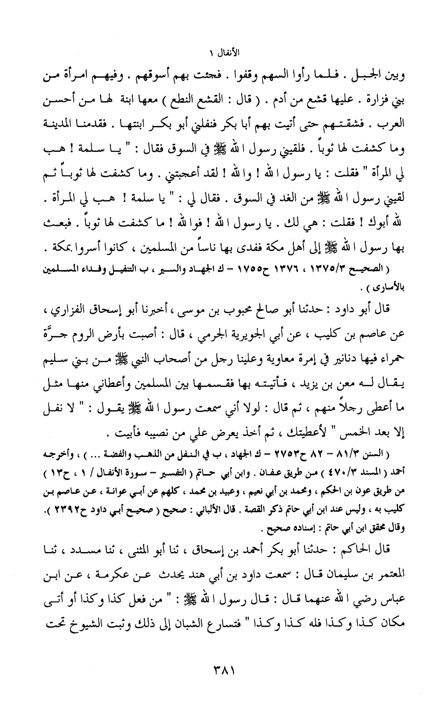 (السنن 3/81-82 ح 2753 - ك الجهاد، ب في النفل من الذهب والفضة ... ) ، وأخرجه أحمد (المسند 3/470) من طريق عفان. وابن أبي حاتم (التفسير - سورة الأنفال/1، ح 13) من طريق عون بن الحكم، ومحمد بن أبى نعيم، وعبيد بن محمد، كلهم عن أبي عوانة، عن عاصم بن كليب به، وليس عند ابن أبي حاتم ذكر القصة. قال الألباني: صحيح (صحيح أبي داودح 2392) .
