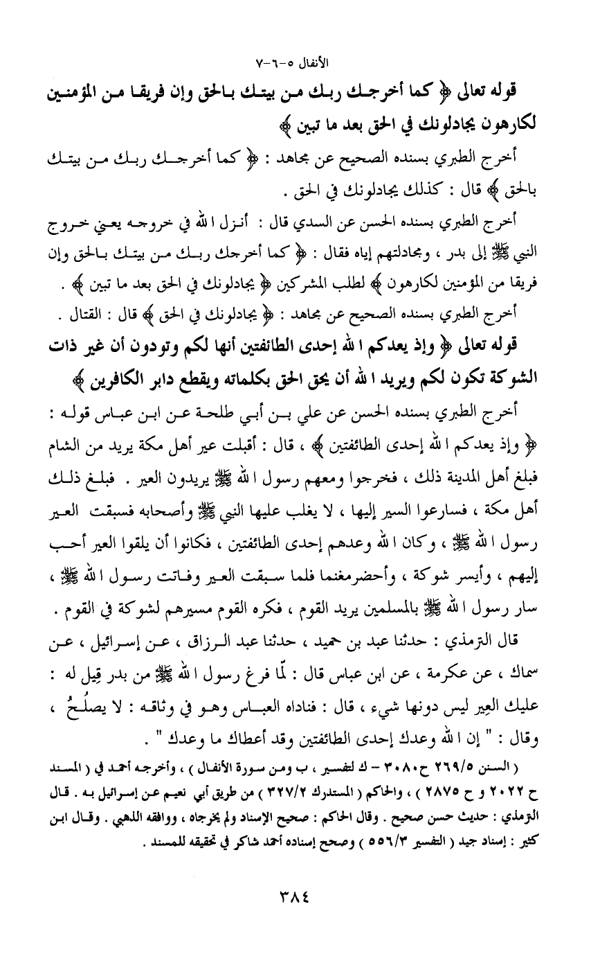 أخرج الطبري بسنده الحسن عن علي بن أبي طلحة عن ابن عباس قوله: (وإذ يعدكم الله إحدى الطائفتين) ، قال: أقبلت عير أهل مكة يريد من الشام فبلغ أهل المدينة ذلك، فخرجوا ومعهم رسول الله - صَلَّى اللَّهُ عَلَيْهِ وَسَلَّمَ - يريدون العير. فبلغ ذلك أهل مكة، فسارعوا السير إليها، لا يغلب عليها النبي - صَلَّى اللَّهُ عَلَيْهِ وَسَلَّمَ - وأصحابه فسبقت العير رسول الله - صَلَّى اللَّهُ عَلَيْهِ وَسَلَّمَ -، وكان الله وعدهم إحدى الطائفتين، فكانوا أن يلقوا العير أحب إليهم، وأيسر شوكة، وأحضر مغنما فلما سبقت العير وفاتت رسول الله - صَلَّى اللَّهُ عَلَيْهِ وَسَلَّمَ -، سار رسول الله - صَلَّى اللَّهُ عَلَيْهِ وَسَلَّمَ - بالمسلمين يريد القوم، فكره القوم مسيرهم لشوكة في القوم.