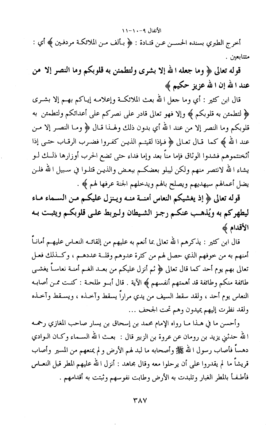 قوله تعالى (وما جعله الله إلا بشرى ولتطمئن به قلوبكم وما النصر إلا من عند الله إن الله عزيز حكيم)