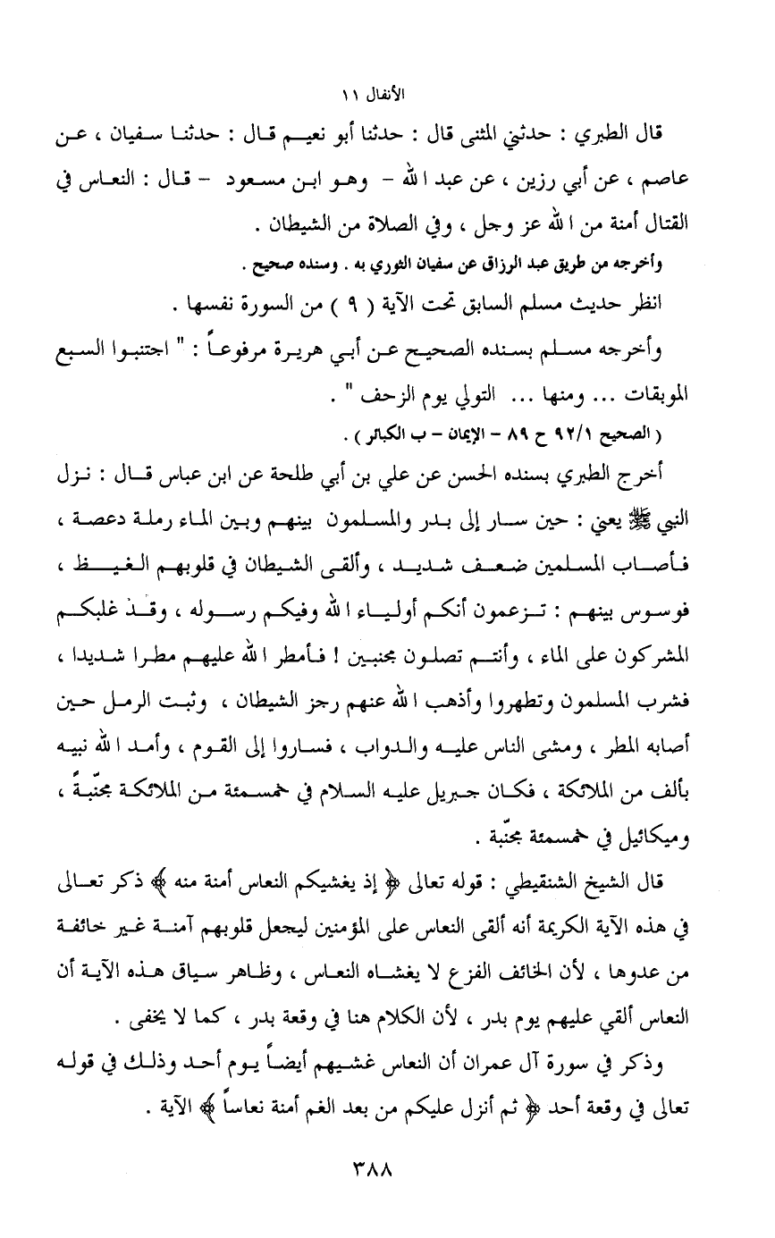 قال الطبري: حدثني المثنى قال: حدثنا أبو نعيم قال: حدثنا سفيان، عن عاصم، عن أبي رزين، عن عبد الله -وهو ابن مسعود- قال: النعاس في القتال أمنة من الله عز وجل، وفي الصلاة من الشيطان.