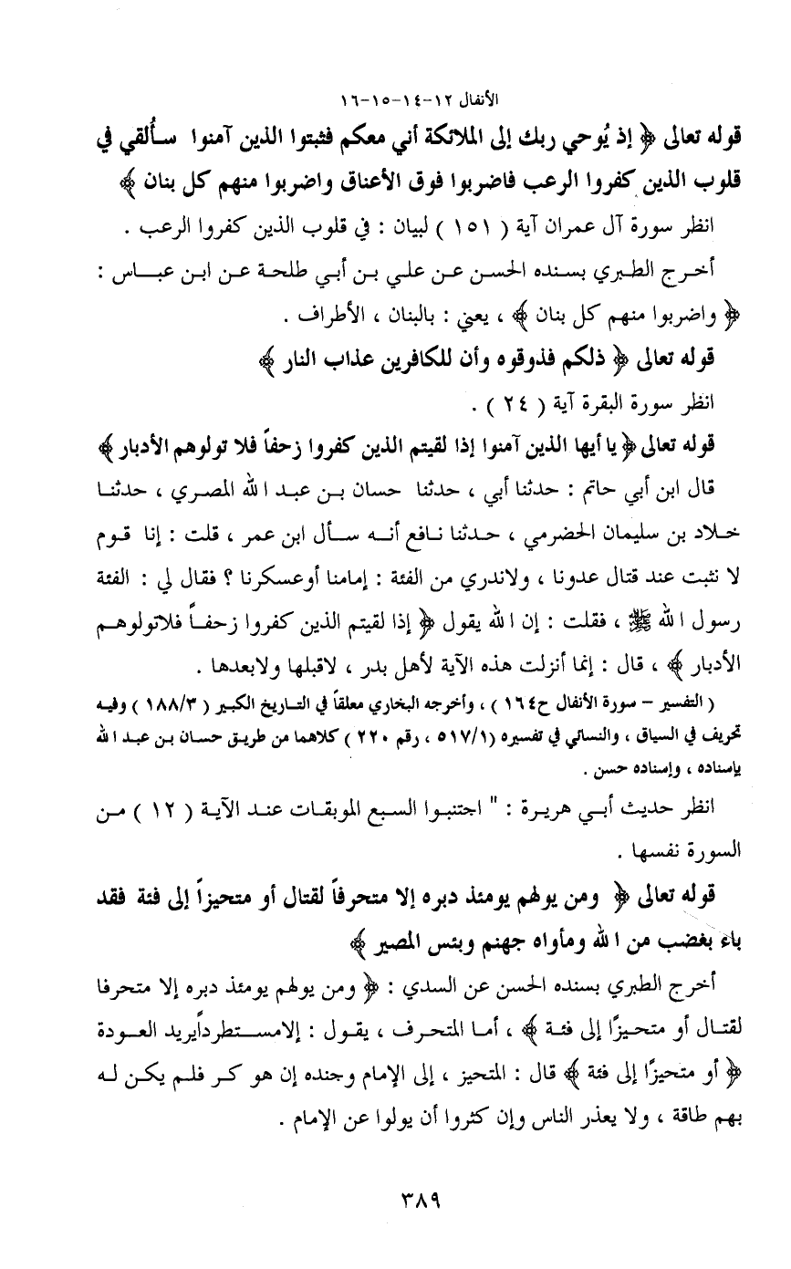 أخرج الطبري بسنده الحسن عن السدي: (ومن يولهم يومئذ دبره إلا متحرفا لقتال أو متحيزا إلى فئة) ، أما المتحرف، يقول: إلا مستطرداً يريد العودة (أو متحيزا إلى فئة) قال: المتحيز، إلى الإمام وجنده إن هو كر فلم يكن له بهم طاقة، ولا يعذر الناس وإن كثروا أن يولوا عن الإمام.