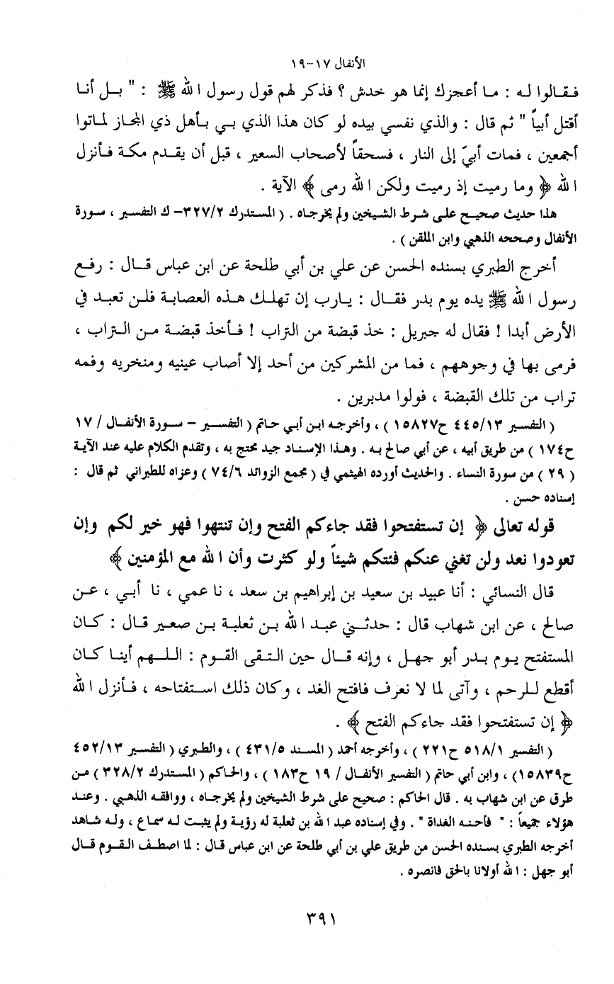 أخرج الطبري بسنده الحسن عن علي بن أبي طلحة عن ابن عباس قال: رفع رسول الله - صَلَّى اللَّهُ عَلَيْهِ وَسَلَّمَ - يده يوم بدر فقال: يارب إن تهلك هذه العصابة فلن تعبد في الأرض أبدا! فقال له جبريل: خذ قبضة من التراب! فأخذ قبضة من التراب، فرمى بها في وجوههم، فما من المشركين من أحد إلا أصاب عينيه ومنخريه وفمه تراب من تلك القبضة، فولوا مدبرين.